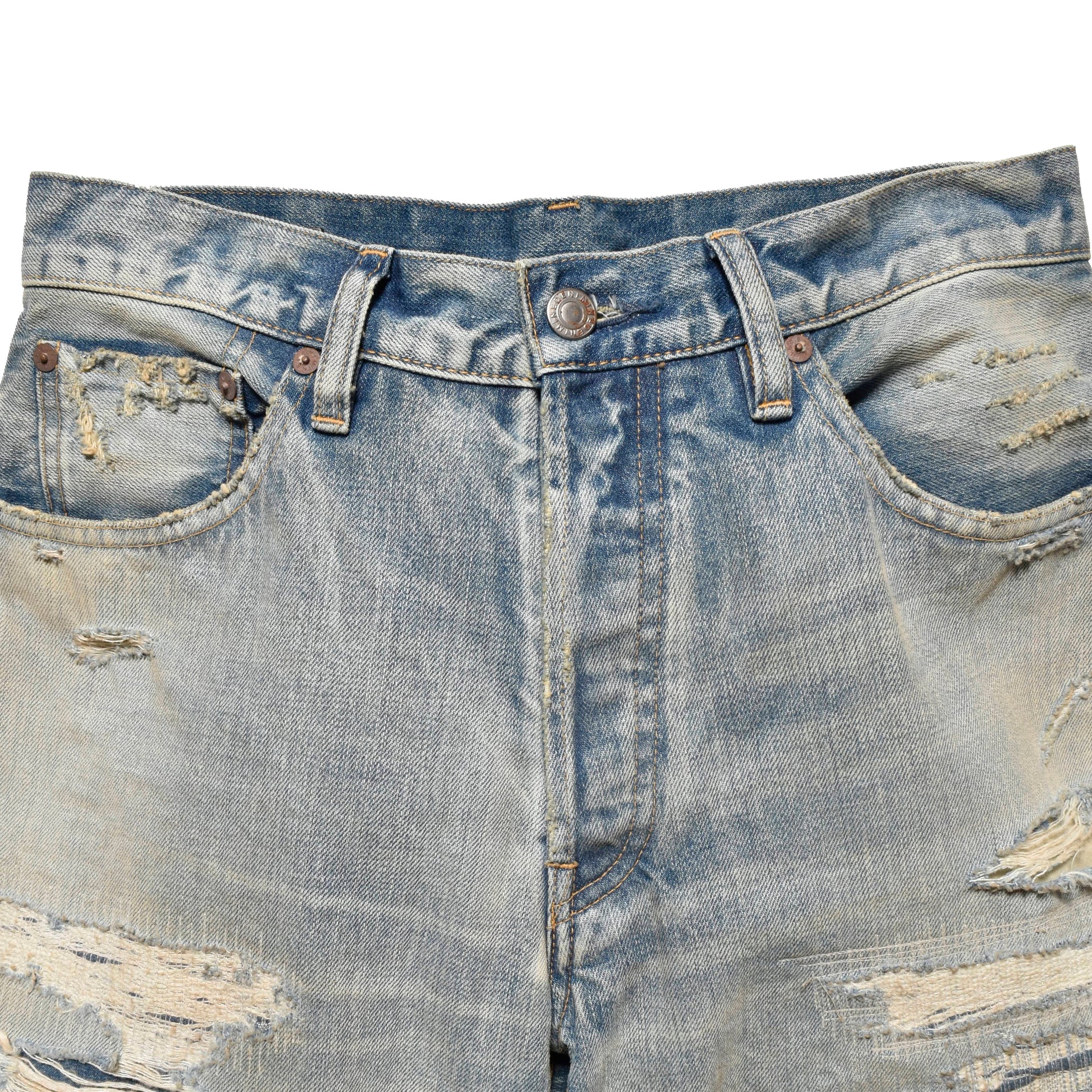 A seasonal design based on the <FPK106ï¼?Wide Straight from the Standard Jeans series. MINEDENIM's signature product. Based on vintage items from the 60s. the base wash fades the color to light blue. and the jeans are specially made with carefully damaged and crushed materials and careful repairs. resulting in a quality that is so good you could mistake them for vintage jeans.