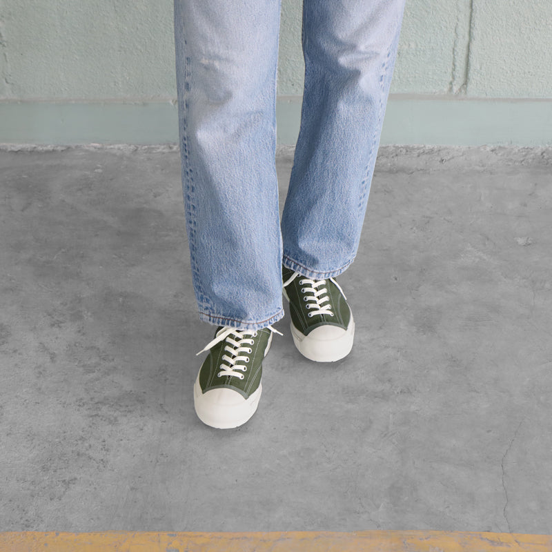 This model has its roots in training shoes produced in the 1960s. The characteristic centre seam design minimises the overlap of the thicker material. which reduces stress on the foot and is said to be suitable for exercise. The material is newly adopted cotton nylon with excellent durability. The outsole has been updated to a more abrasion-resistant specification.