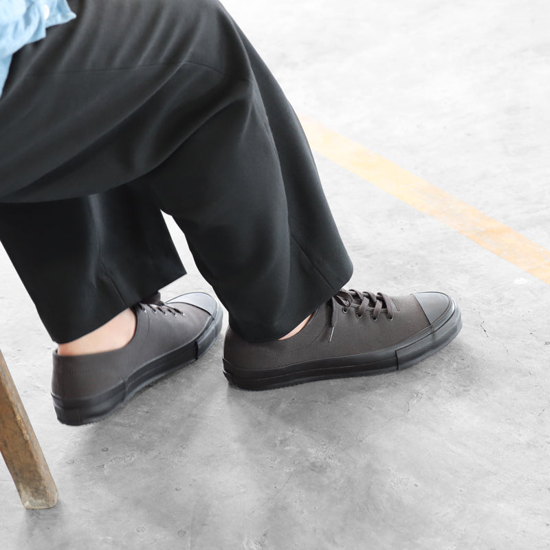 This model has its roots in athletic shoes produced in the 1970s. Elements of athletic shoes. such as the toe cap and reinforced fabric at the footwear opening. were retained. while the wooden pattern used was reviewed to create a silhouette that is easy to use in everyday life.