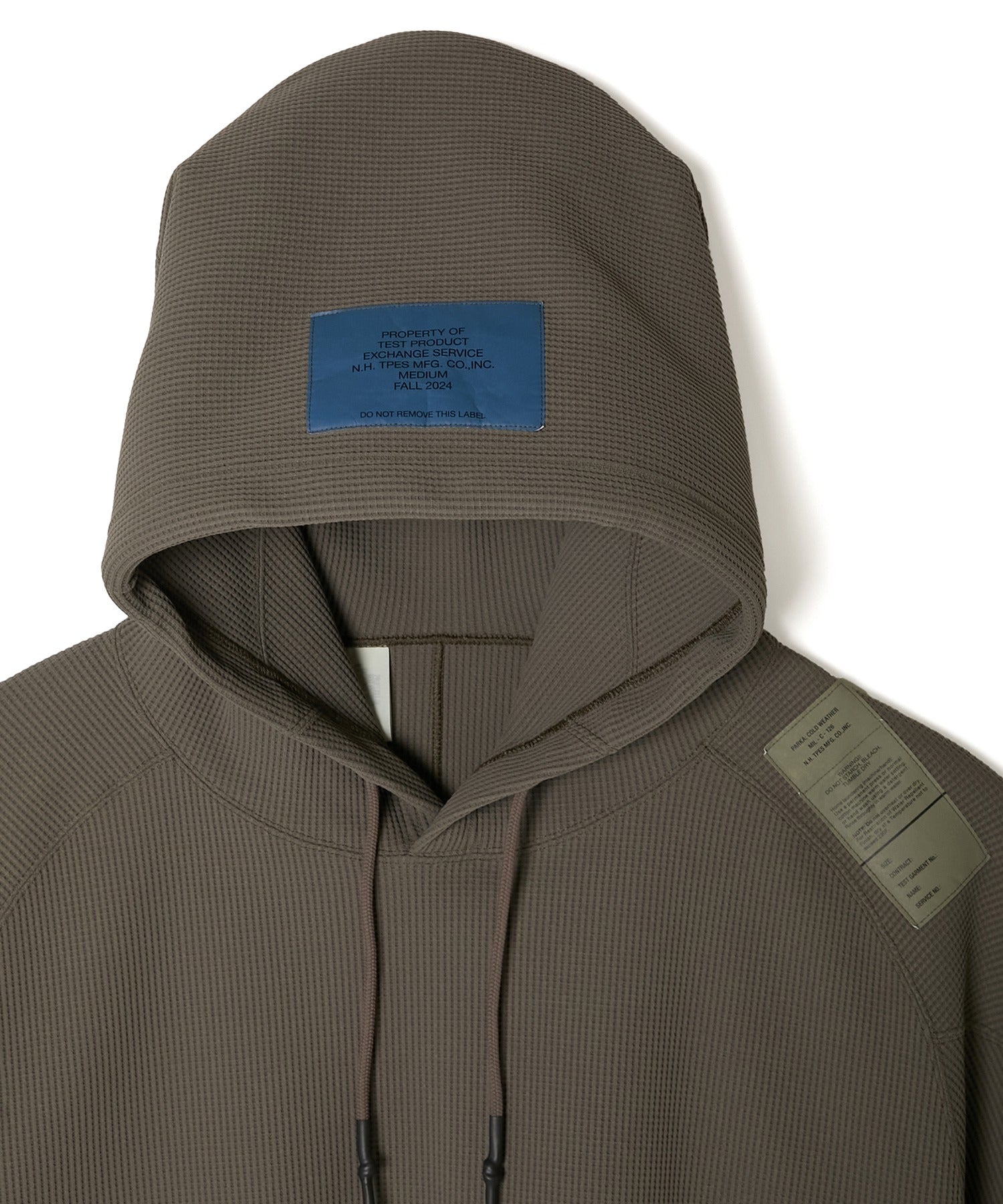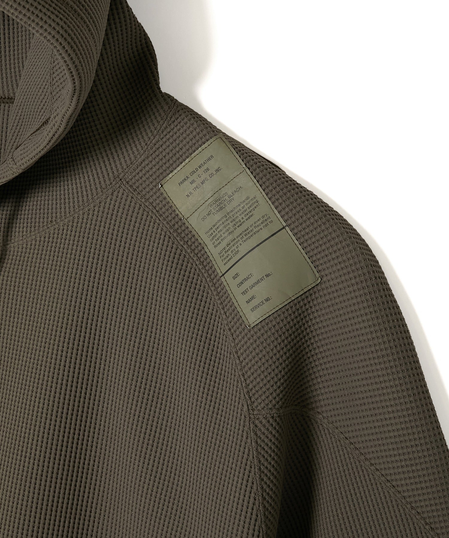 ・Three-dimensional tailoring. the sleeves feature a wide armhole and darts at the elbows. creating a balanced volume and rounded silhouette. Distinctive paneling integrates elements from the blouson. The oversized hood is inspired by the Swedish military's M-90 Cold Weather Parker. Thumb holes at the cuffs. ribbed detailing on sleeves and hem. Constructed with triple-needle stitching for enhanced strength and rugged appeal. Original size specifications on the back. and original mil-spec on the left sleeve.