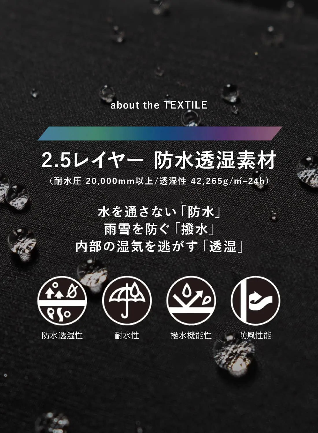 The outer fabric is made of lightweight. highly durable 2.5-layer waterproof and breathable material.