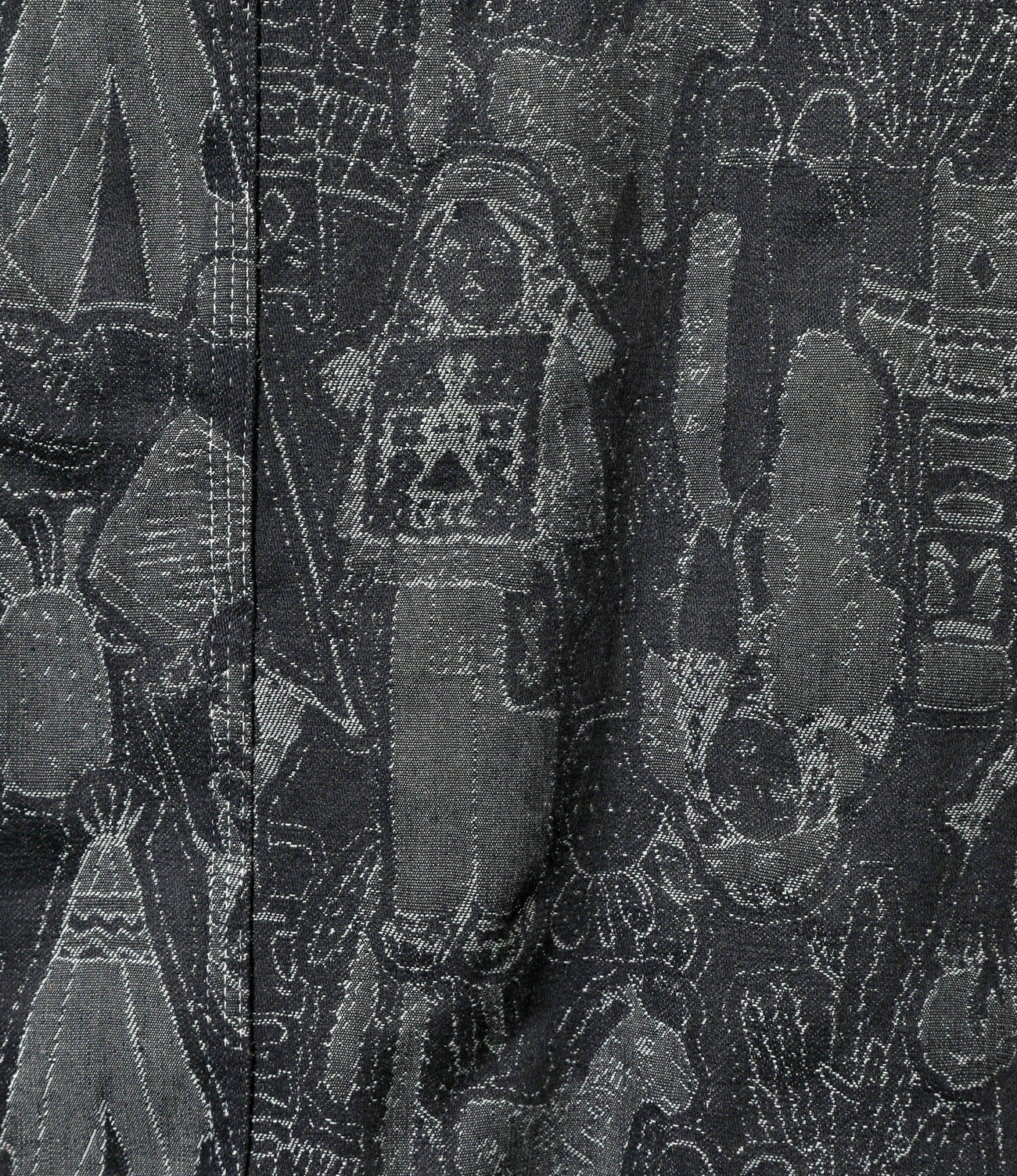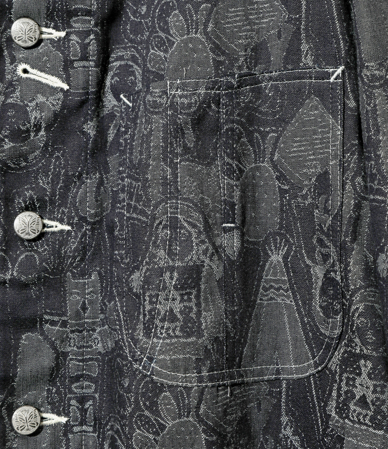 A standard item with many unique designs. such as a cut-off collar. raglan sleeves. round pockets. and an asymmetrical chest pocket set slightly toward the center. The collar and sleeves have a locking process. giving a sense of commitment to the arrangement as if it had been remade. Made of a very unique denim material that makes traditional Native American dolls stand out. At 7 ounces. the material has a very light finish that is suitable for the spring and summer seasons.
