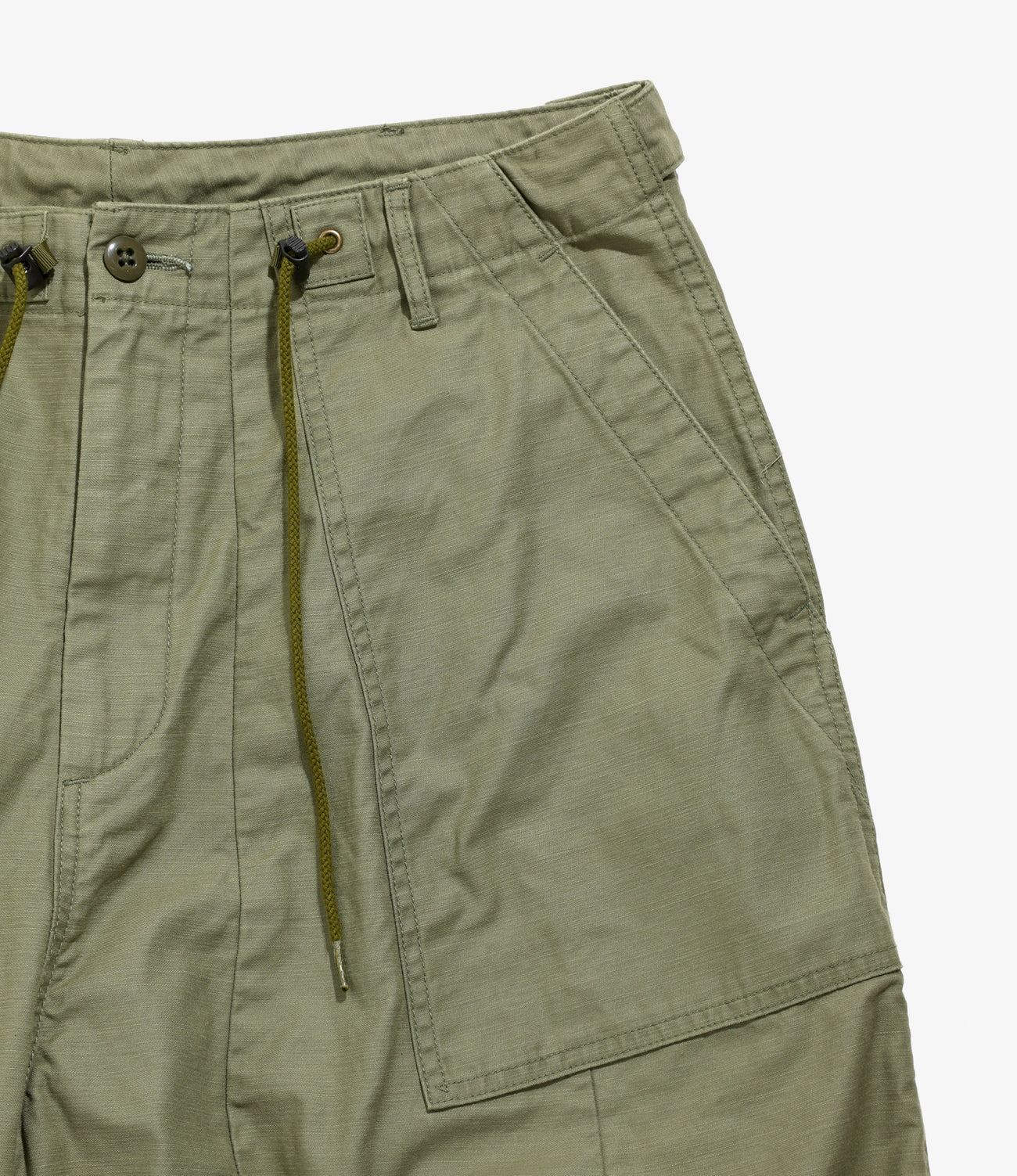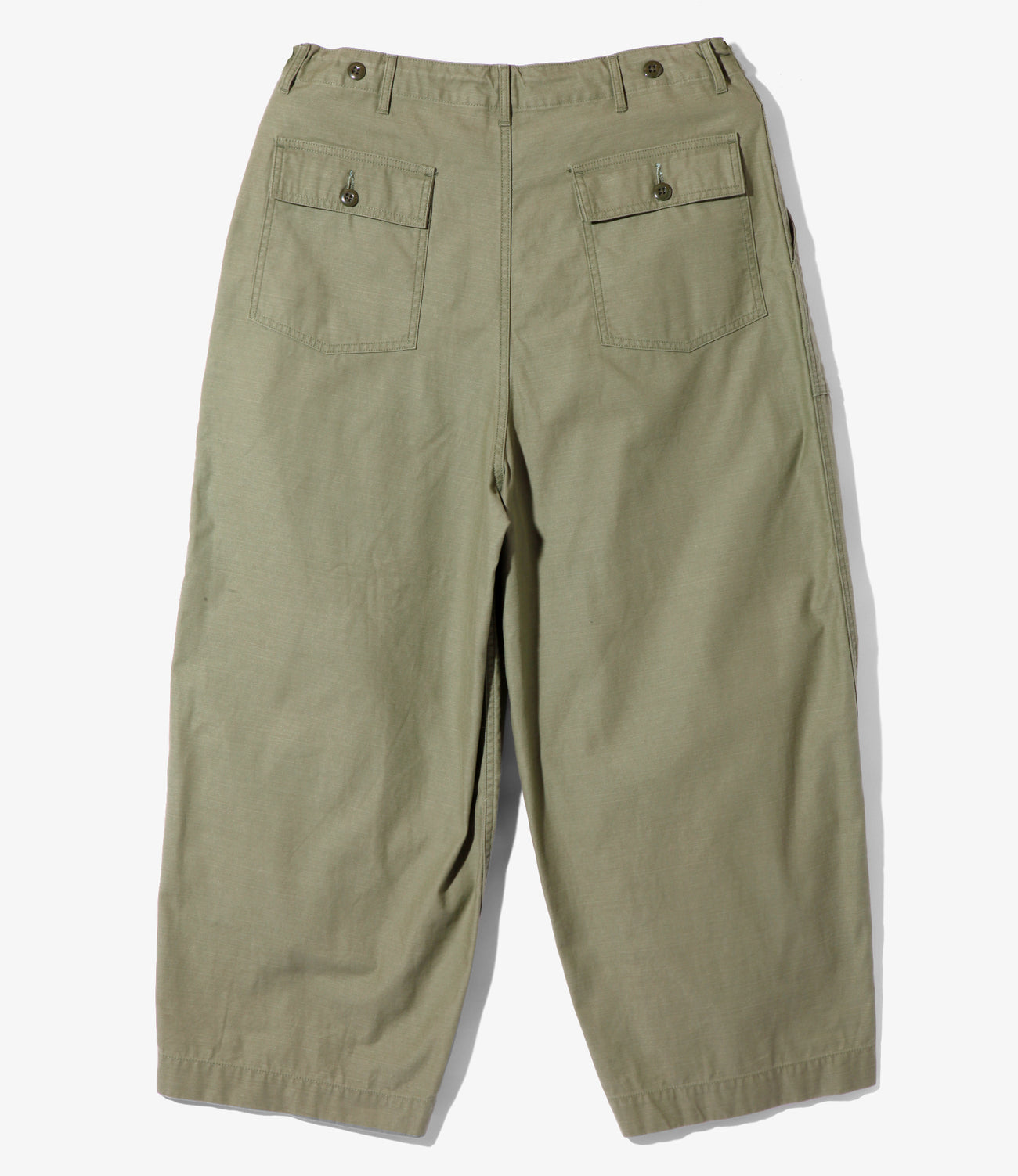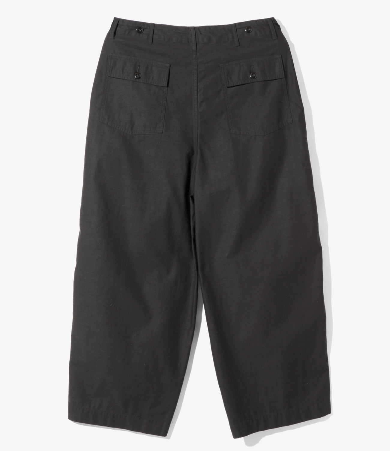 The popular H.D. pants have a unique silhouette with a large puffed front due to darts at the waist and hem. The relaxed. wide silhouette is also appealing for its open. comfortable fit. They are available in a variety of designs. but the fatigue pants feature details such as an L-shaped pocket on the front and side adjusters. They are made of firm cotton back satin.