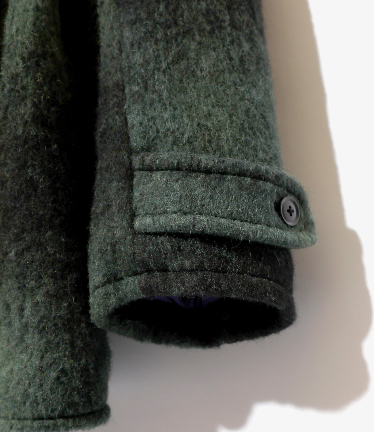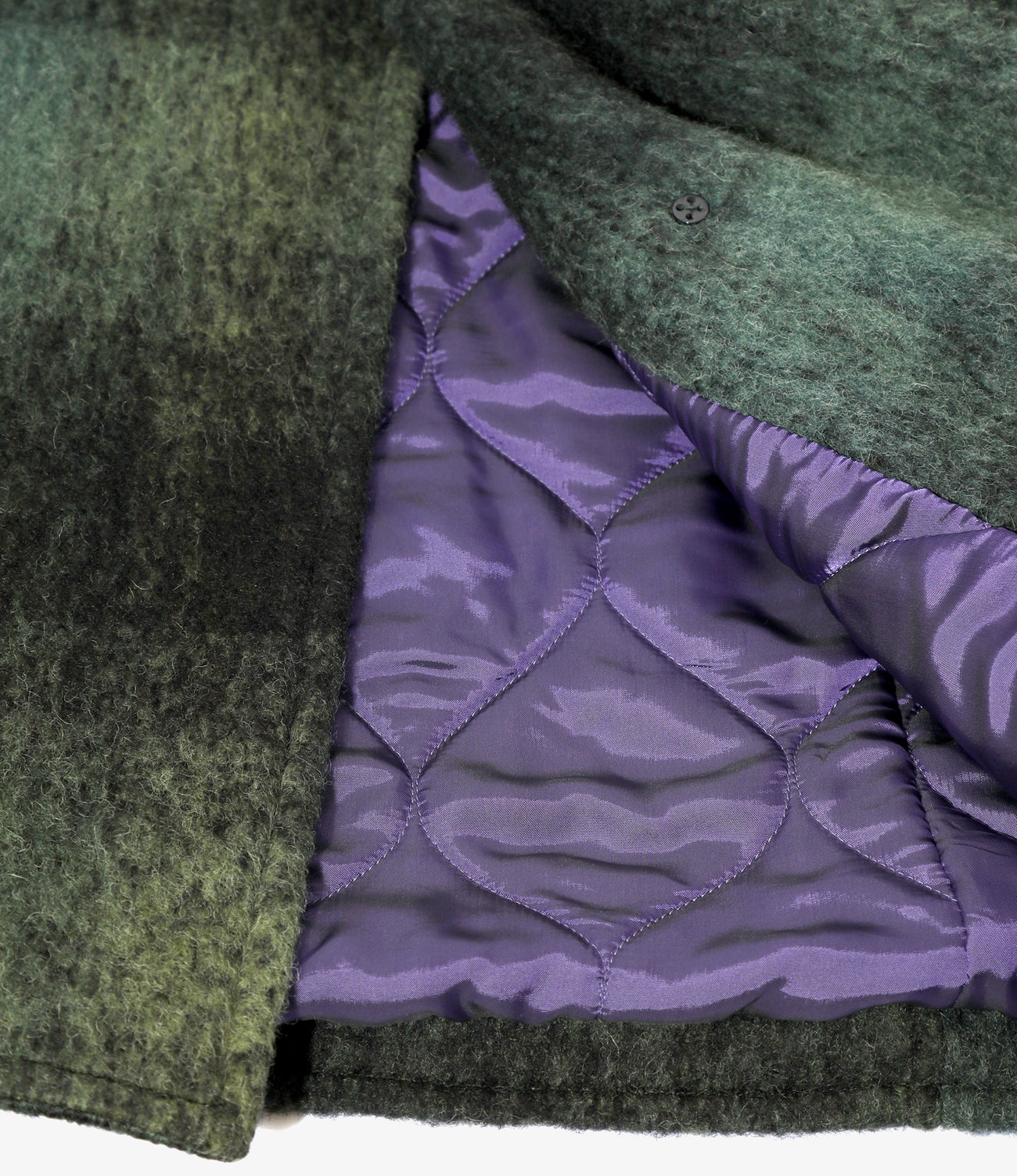 An authentic pea coat made from long-pile shaggy material. The soft plaid pattern and warm. smooth texture create an attractive finish. Quilted material is used for the lining. which not only improves heat retention. but also provides a light and comfortable fit that exceeds the voluminous appearance.