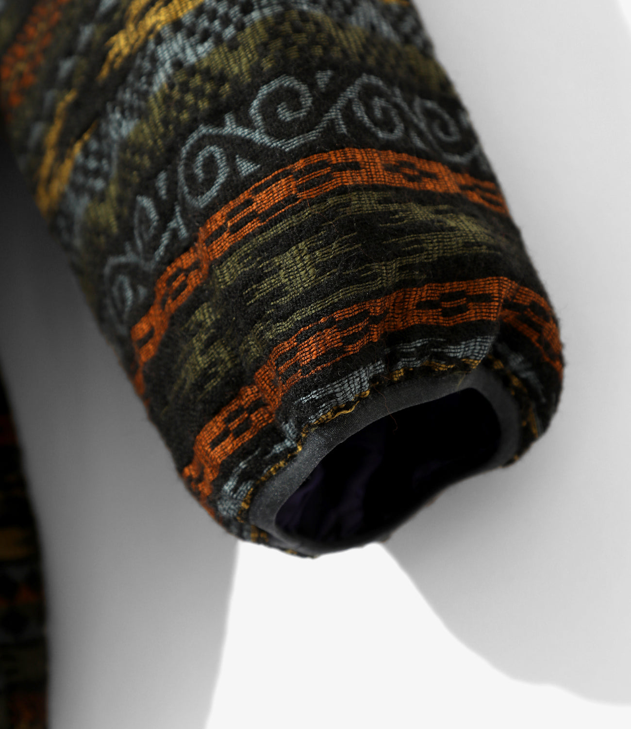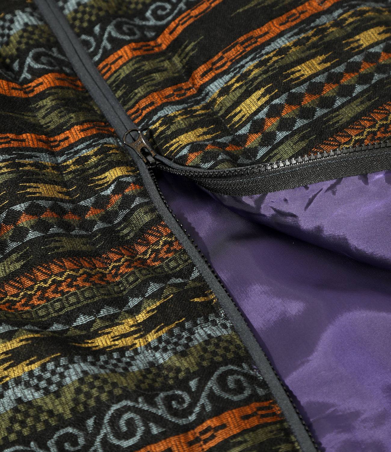 A quilted jacket featuring a stand collar and a roomy wide silhouette. The edges are carefully piped to create a soft look. The shell is made of wool jacquard material with a native pattern. giving it a unique finish.