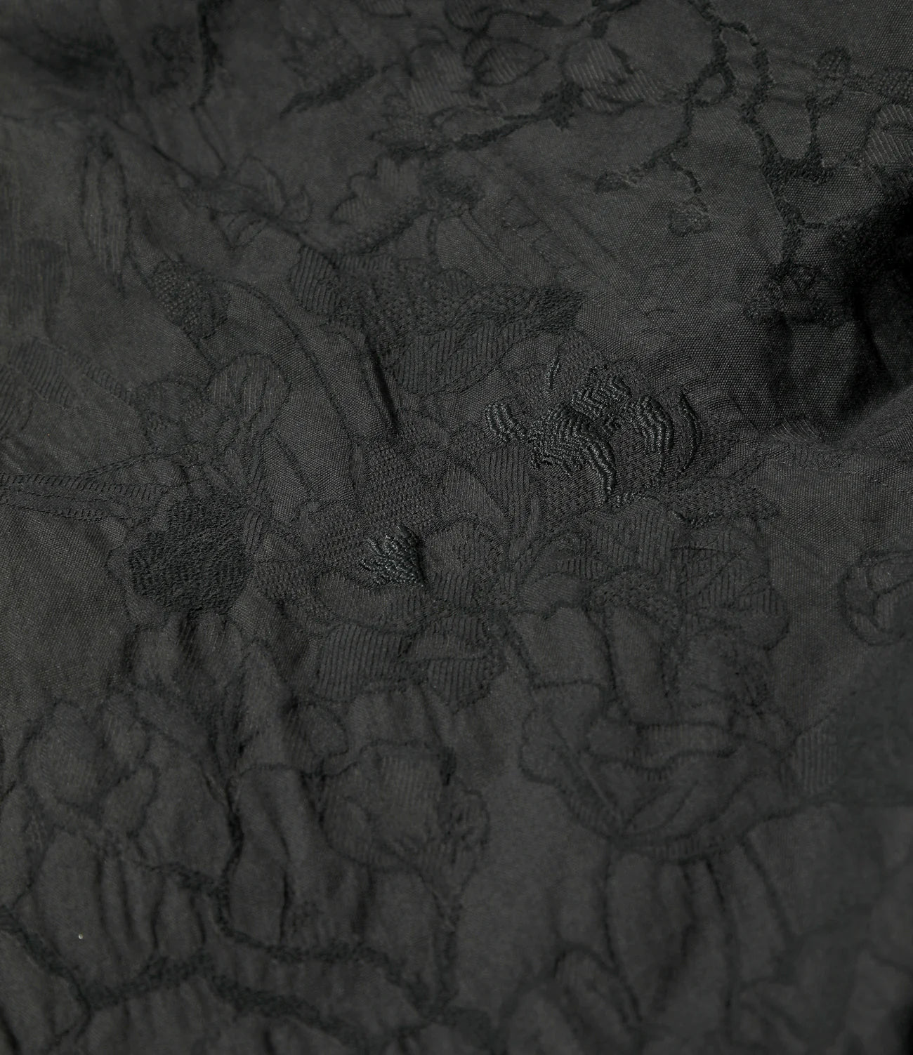 A shirt jacket with a simple design featuring a stand-up collar. Made of jacquard material with an original papillon (butterfly) embroidery. it has a unique finish.