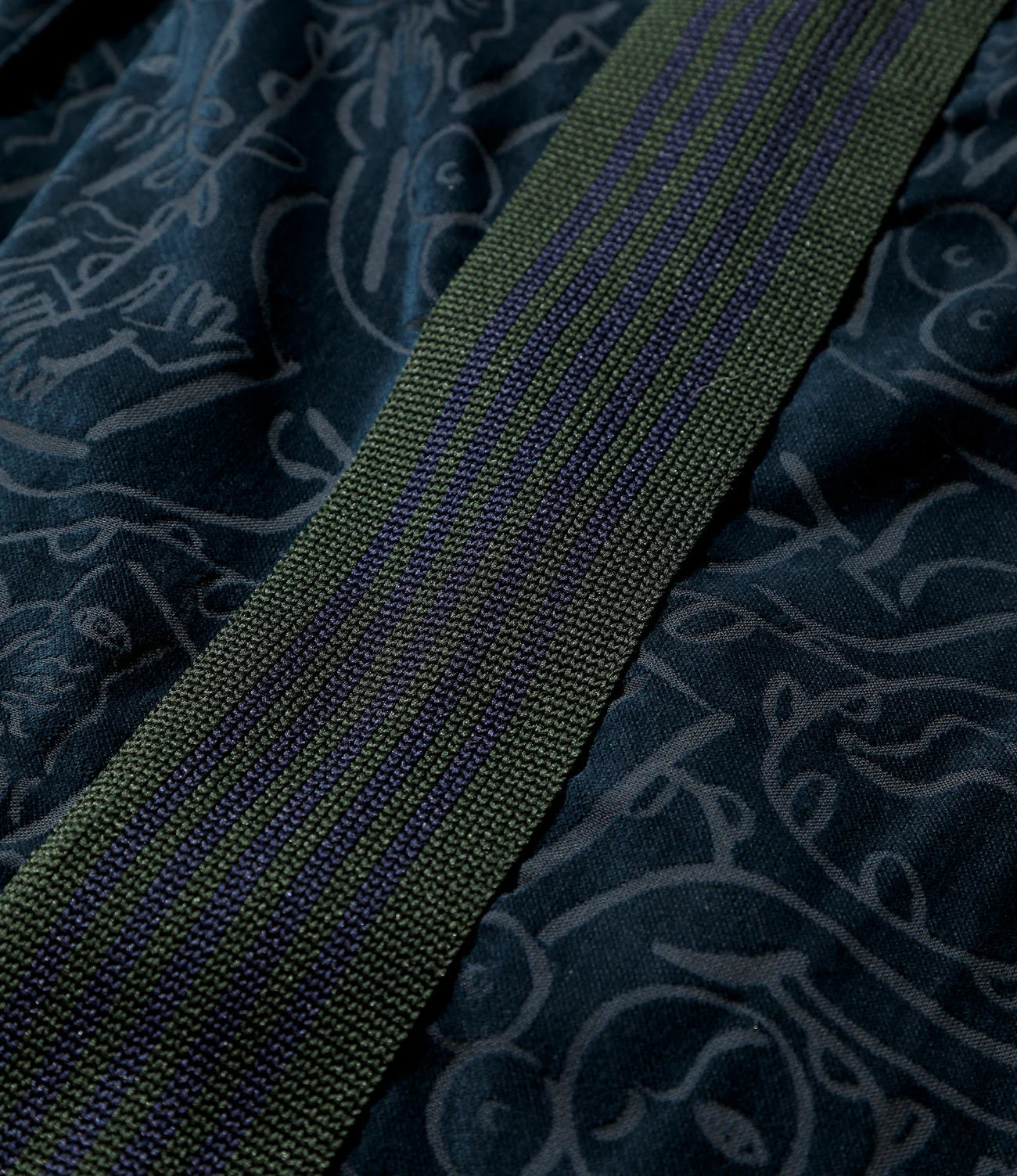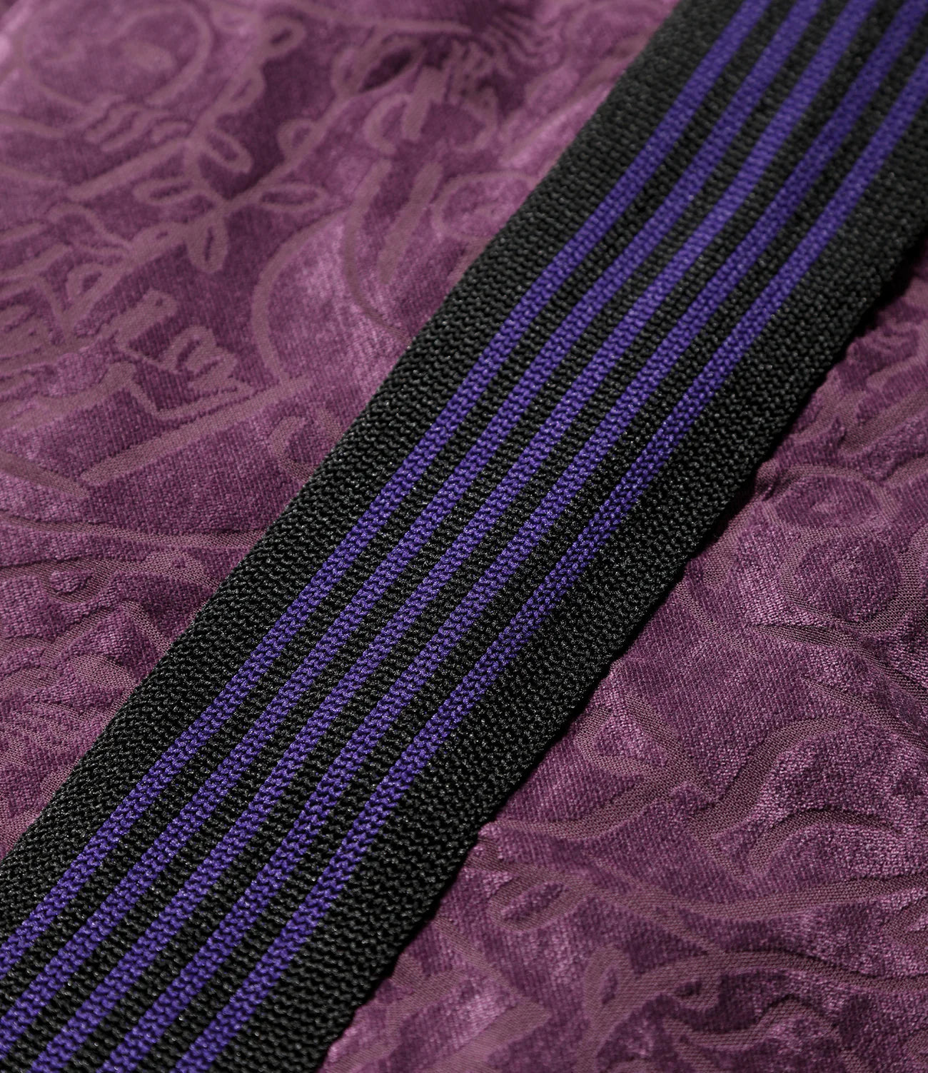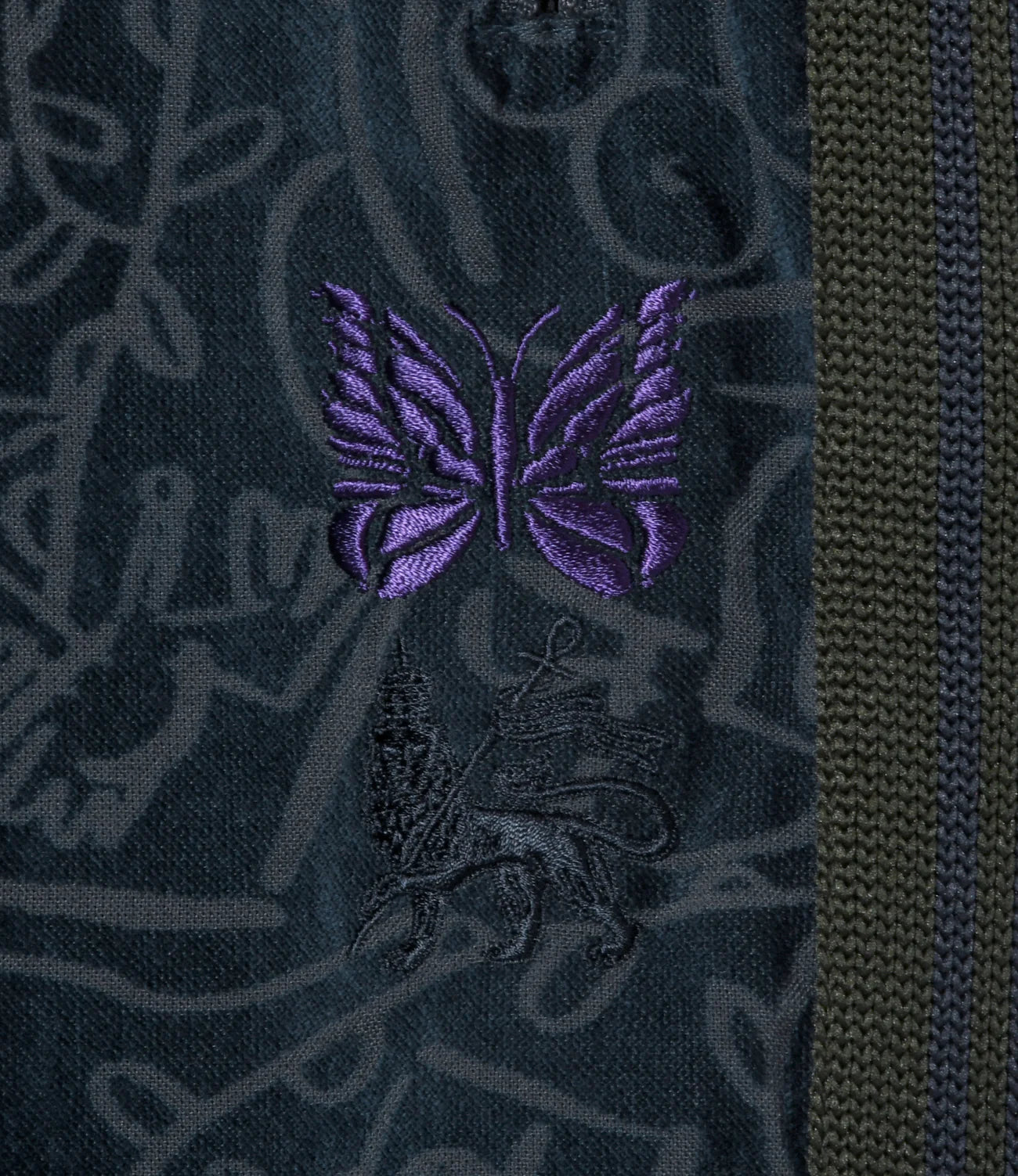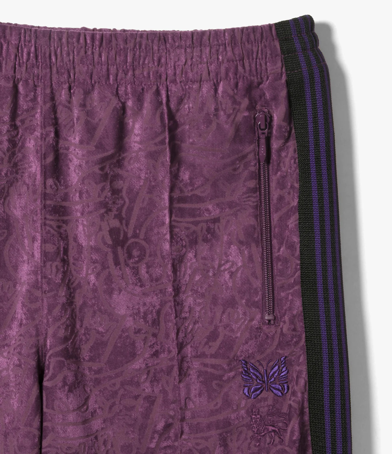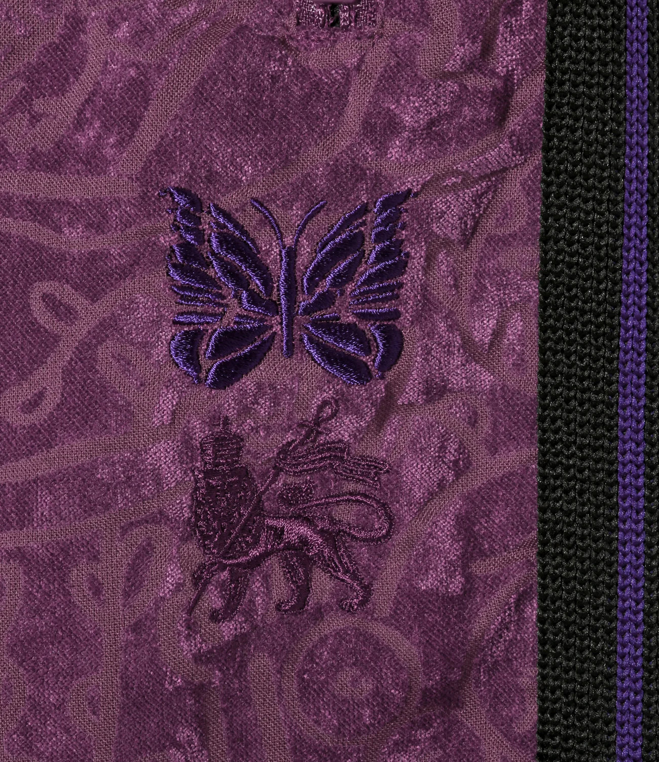 <NEEDLES> A classic track pants item with <Sasquatchfabrix.>'s CUBISM "LOVE & PEACE" pattern. The velvet is made using a processing method called opal processing. which allows only the fabric of the pattern to be transparent. giving it a gorgeous impression. This season. we are using NEEDLES' original tape. which features a rough weave on the side line. The logos of both brands are embroidered vertically on the left leg.