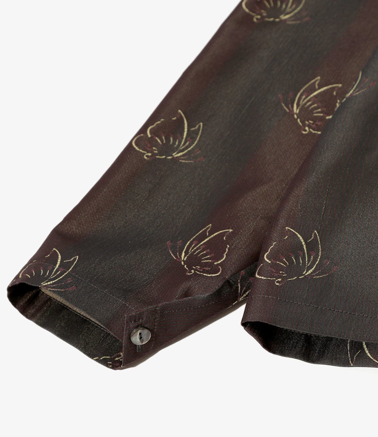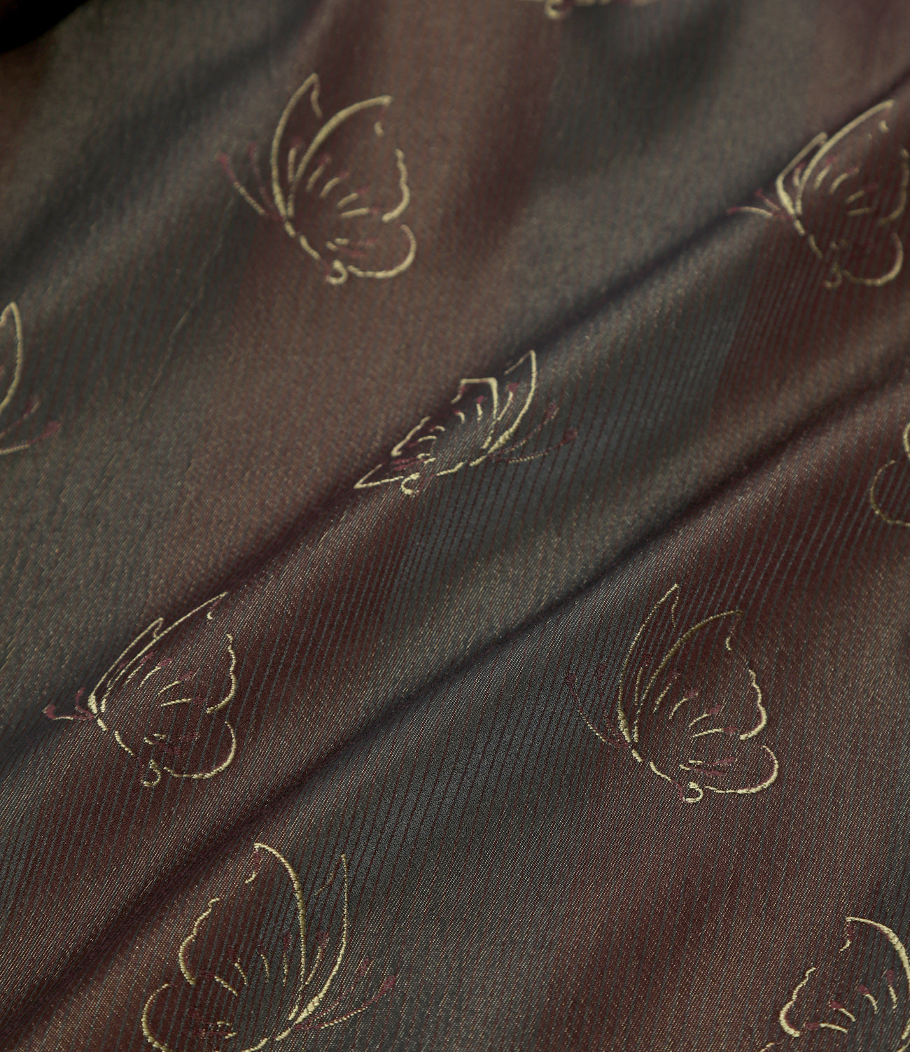 This V-neck shirt has a cardigan-like design with a deep. open V-neck. A flap pocket is attached to the left chest. The fabric created for this season's collection is a beautiful jacquard fabric with gradually blurring stripes overlaid with a fluttering butterfly motif.