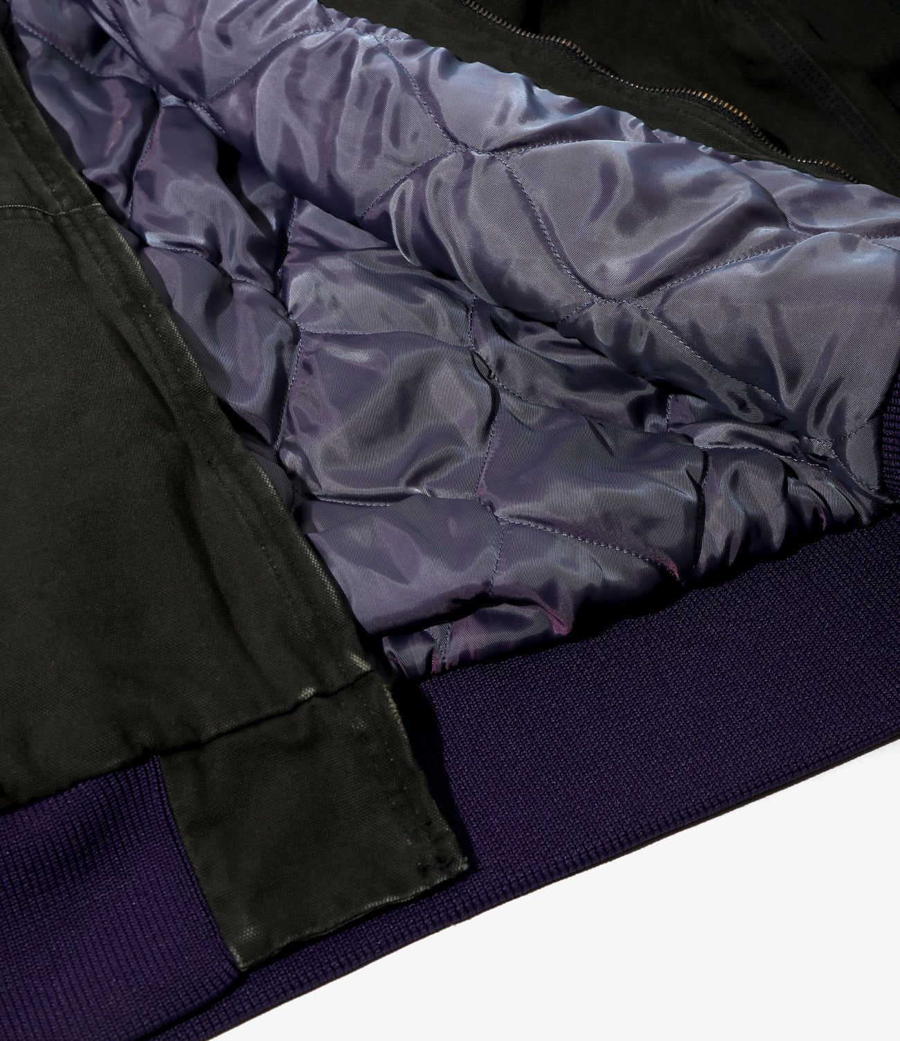 A casual hoodie-style work jacket with a front zip has been released. It is made of cotton material with a realistic vintage feel. reproduced by bio-washing and ozone bleaching. The collar and sleeves are switched with purple ribbing. typical of NEEDLES. The lining is made of purple quilting. which also provides warmth.