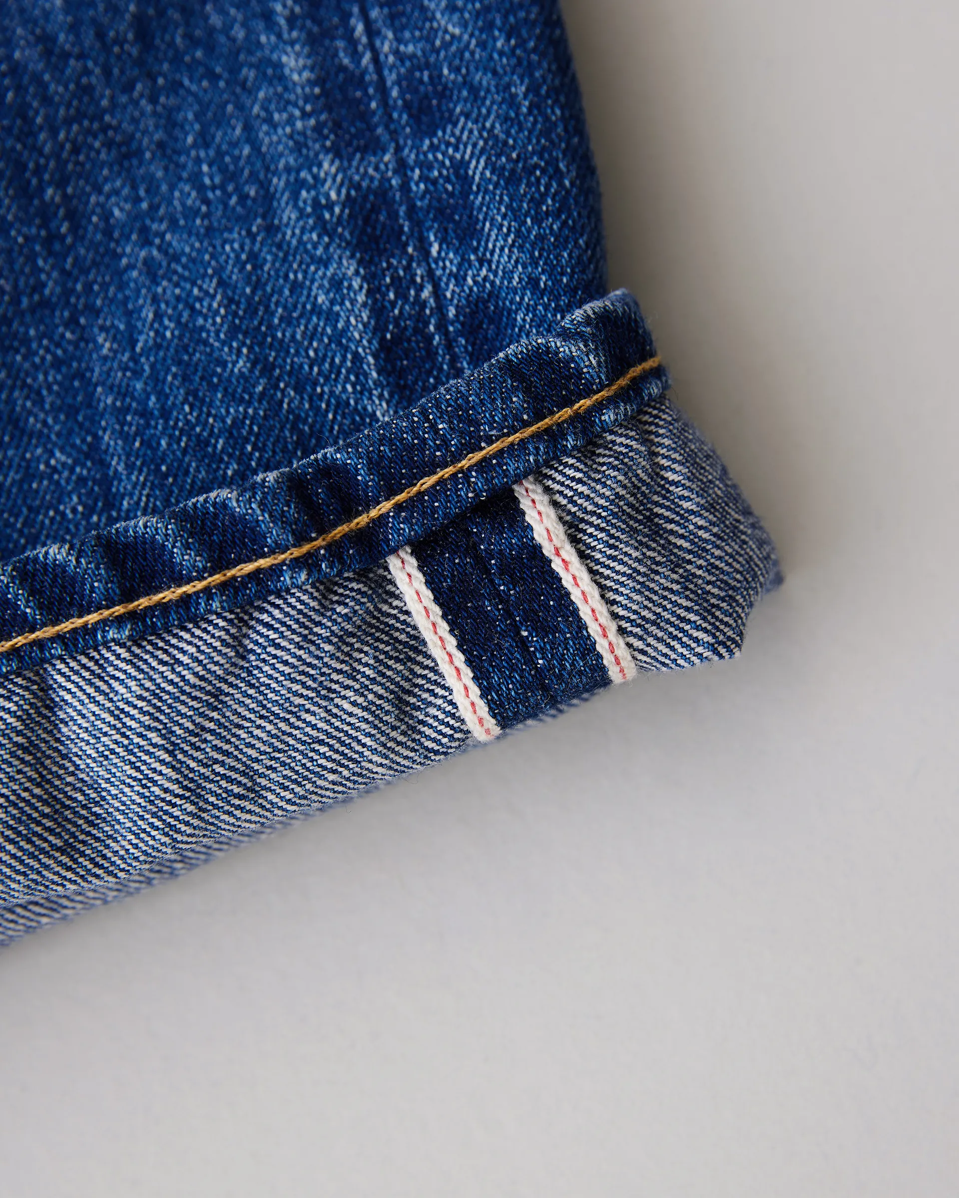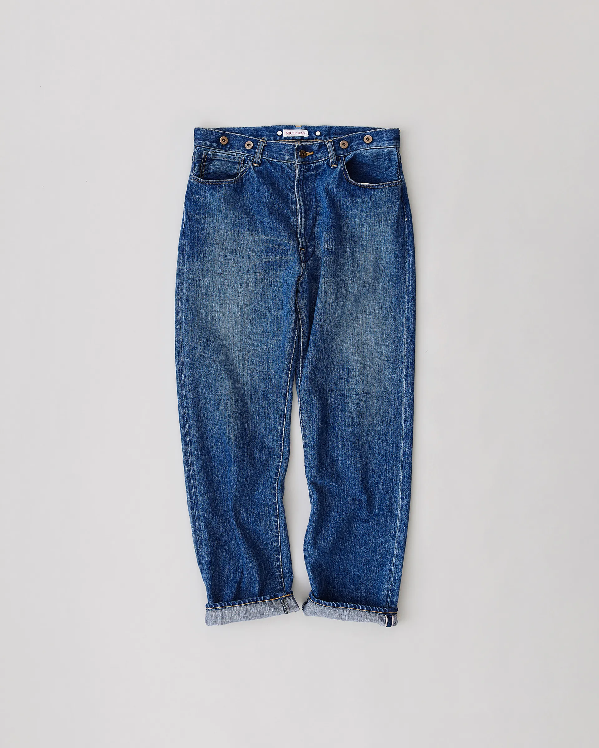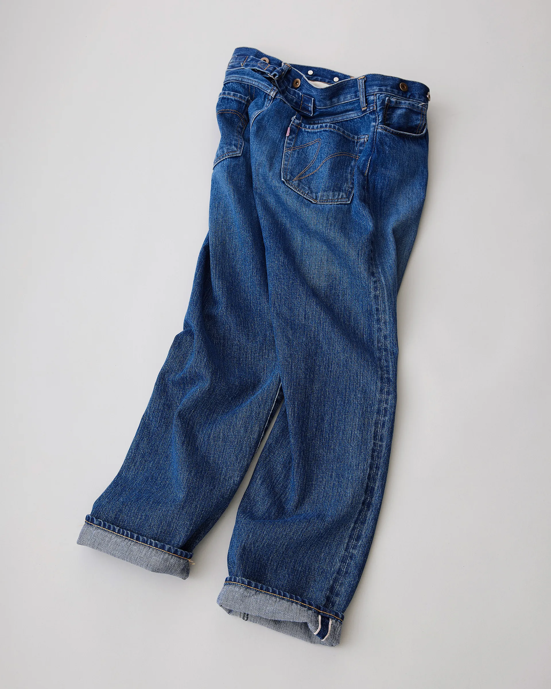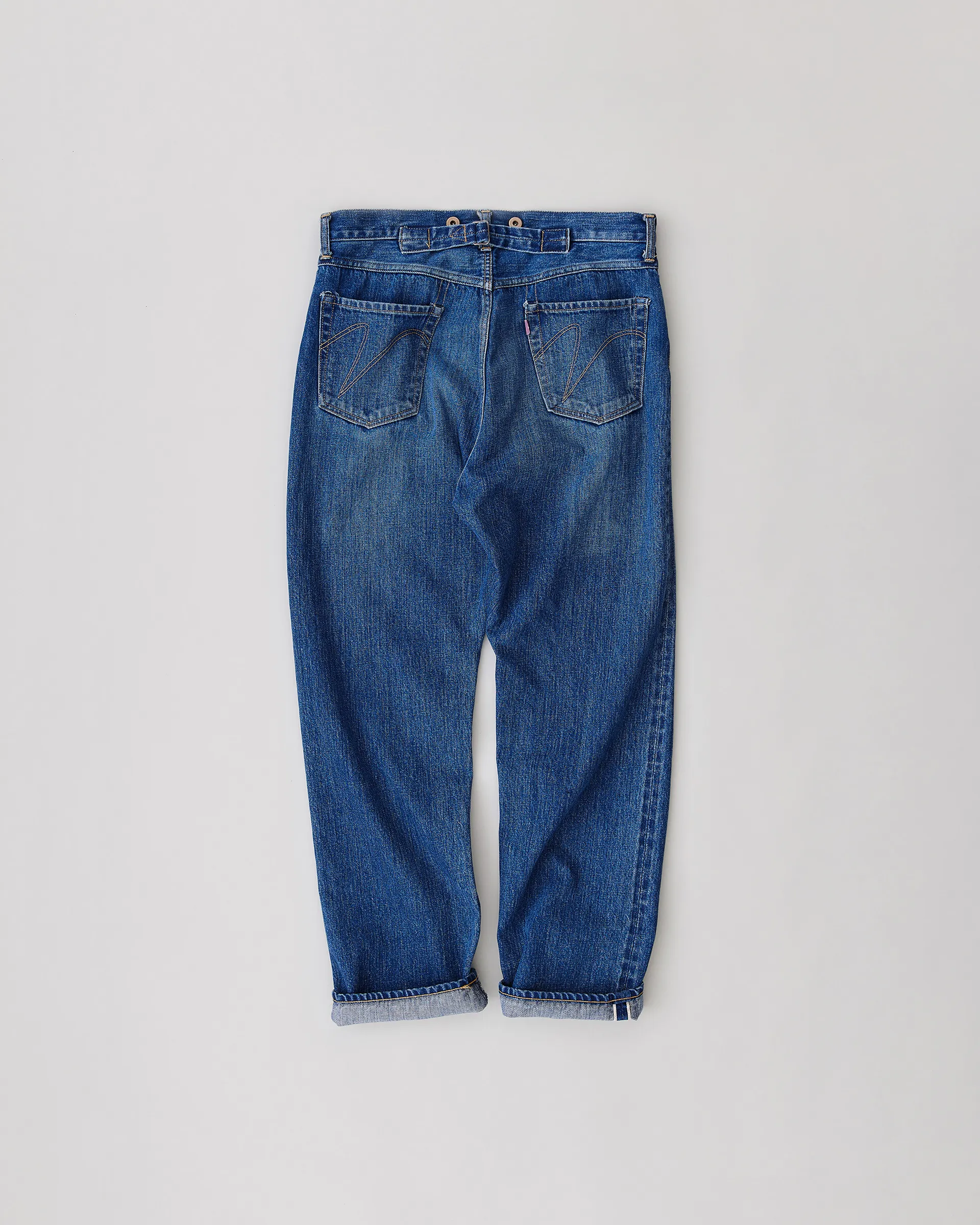 These 12.5oz selvedge denim jeans are made from American cotton ring-spun and woven on a shuttle loom. They are specially hand-processed to recreate the aged look with uneven yarn texture and color shading. The design references jeans from the 1920s to 1950s. and these narrow-cut 5-pocket jeans have a classic look with rounded back pockets and stitching work. The details of the back yoke and the cutting method of the fabric are carefully crafted to create the mood of early 1920s denim.