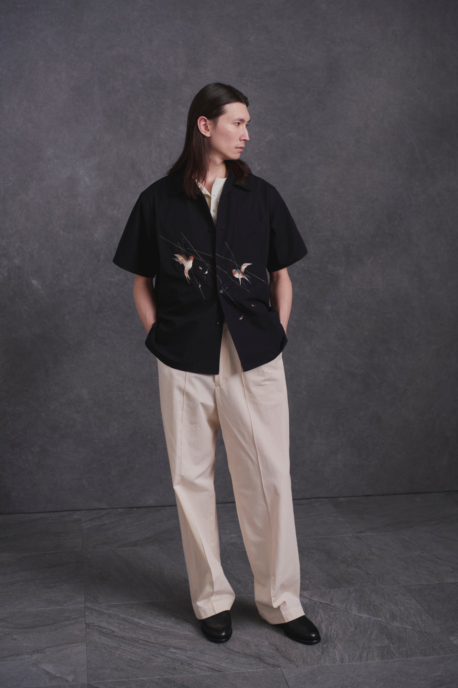 The material is a chino cloth made of 30/1 combed yarn for the warp and 20/1 cotton-linen for the weft. which has been kneaded and softened at every stage to emphasize the rough feel of the linen. The fabric has a natural washed feel with a fluffy texture.