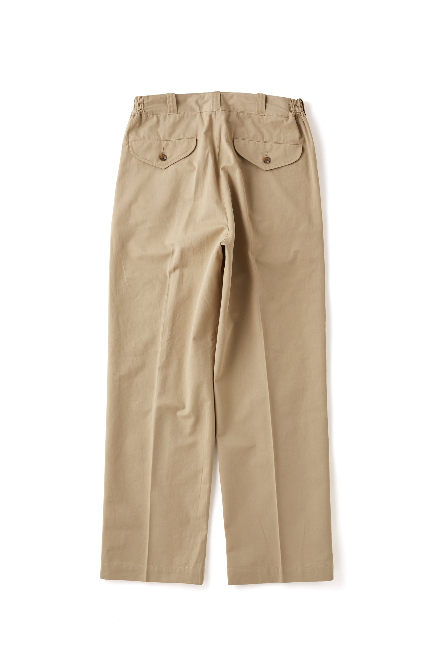 One of our signature pieces. military trousers. Inspired by mid-century military archive designs. the simple design features pin tucks with striking details and elastic bands on the side waist. giving a glimpse of the good old design that tickles your heart. The fitting line also has a classical image. and the straight fit that falls without being narrowed to the hem creates a beautiful silhouette regardless of the line of your legs.