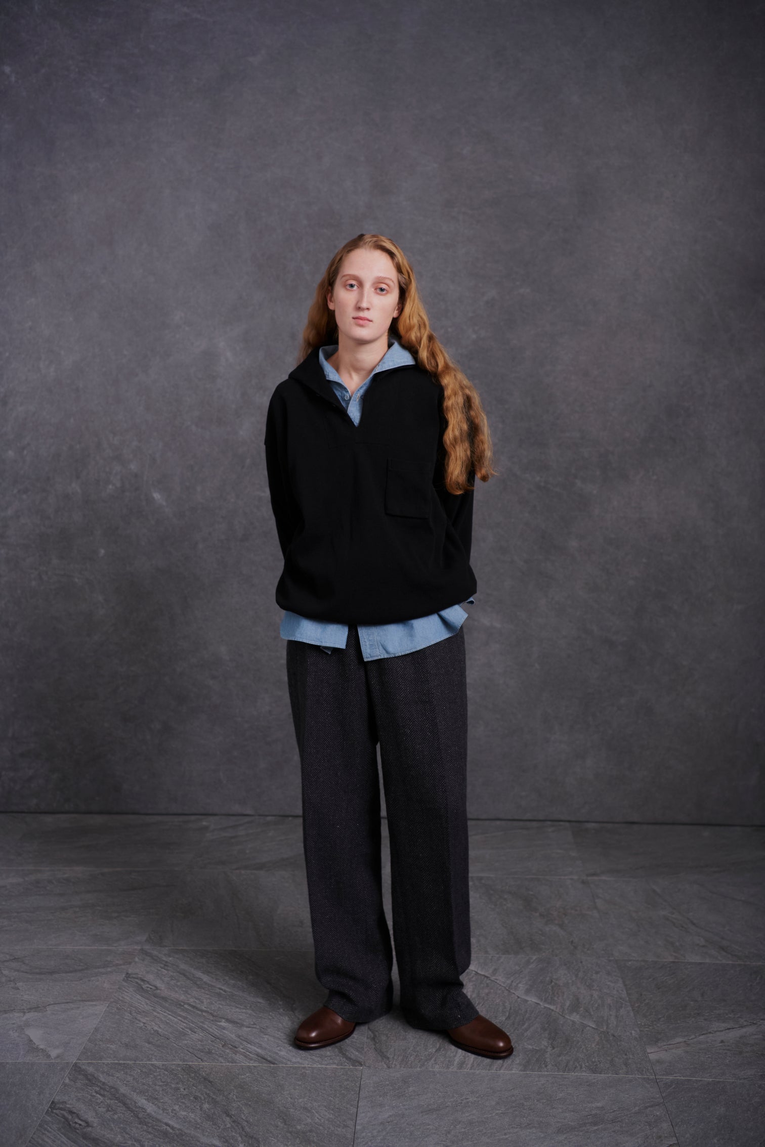 The material is a milling knit made from yarn that reproduces the yarn used in denim known as the war model. The yarn itself has many knots and neps. making it difficult to knit. but it is characterized by a rough texture with unique neps and a natural unevenness.