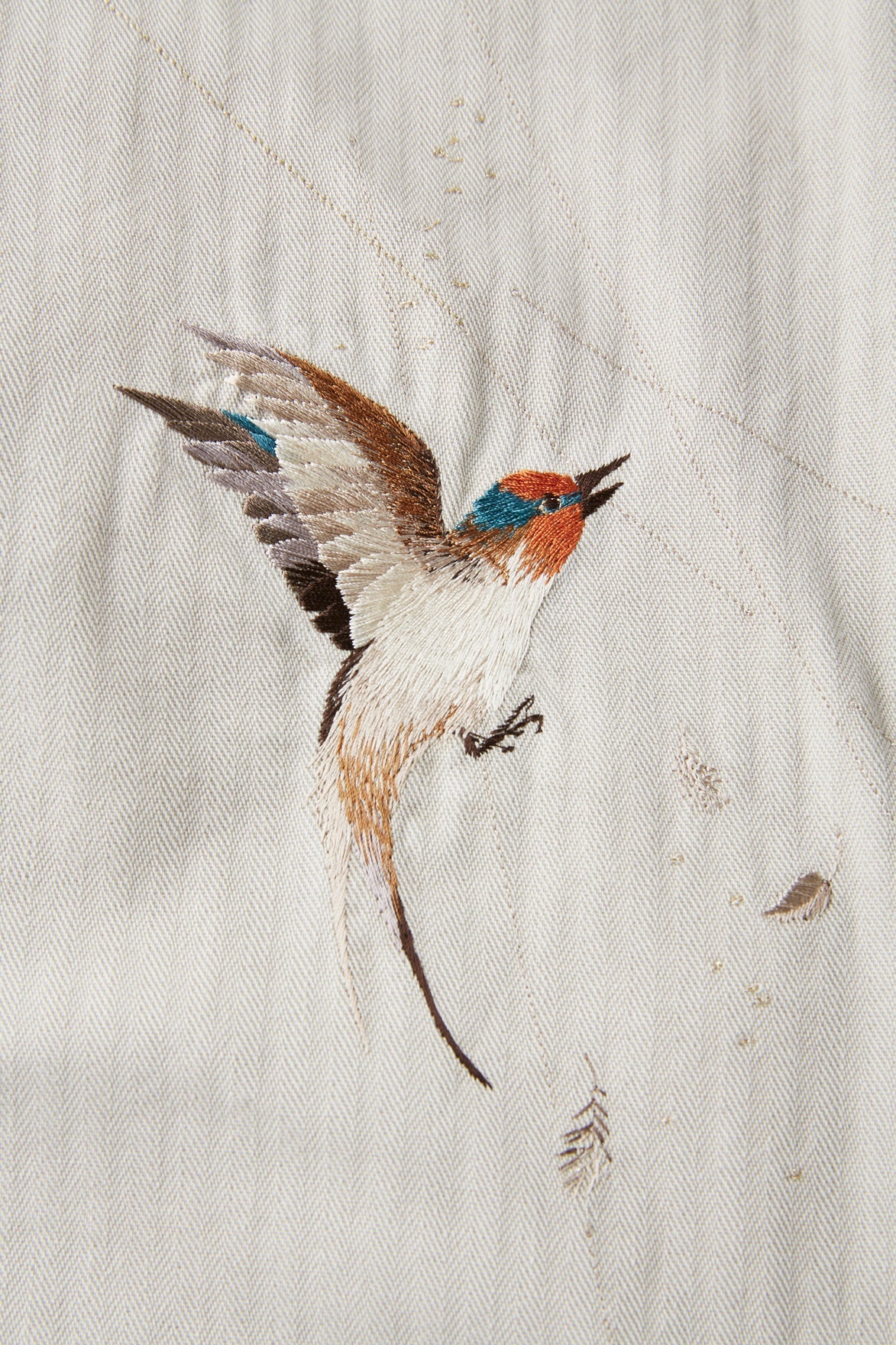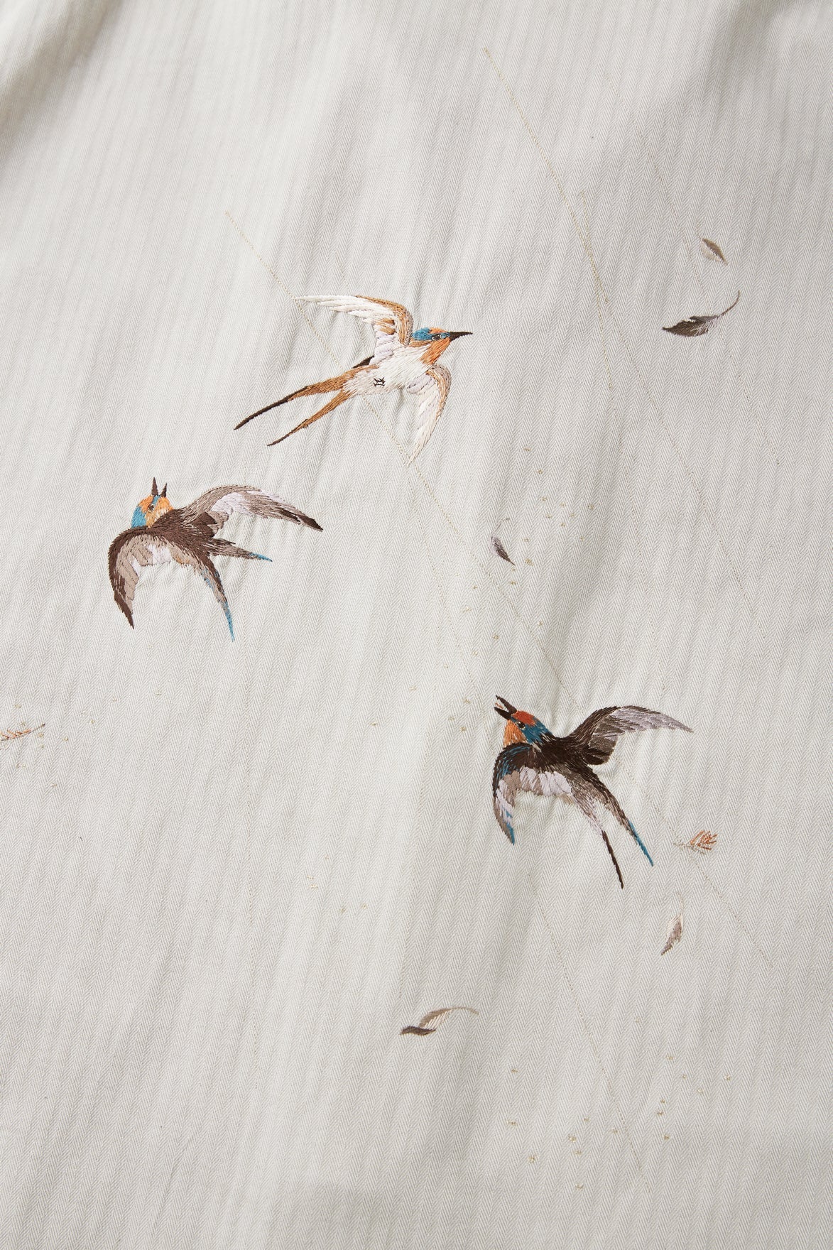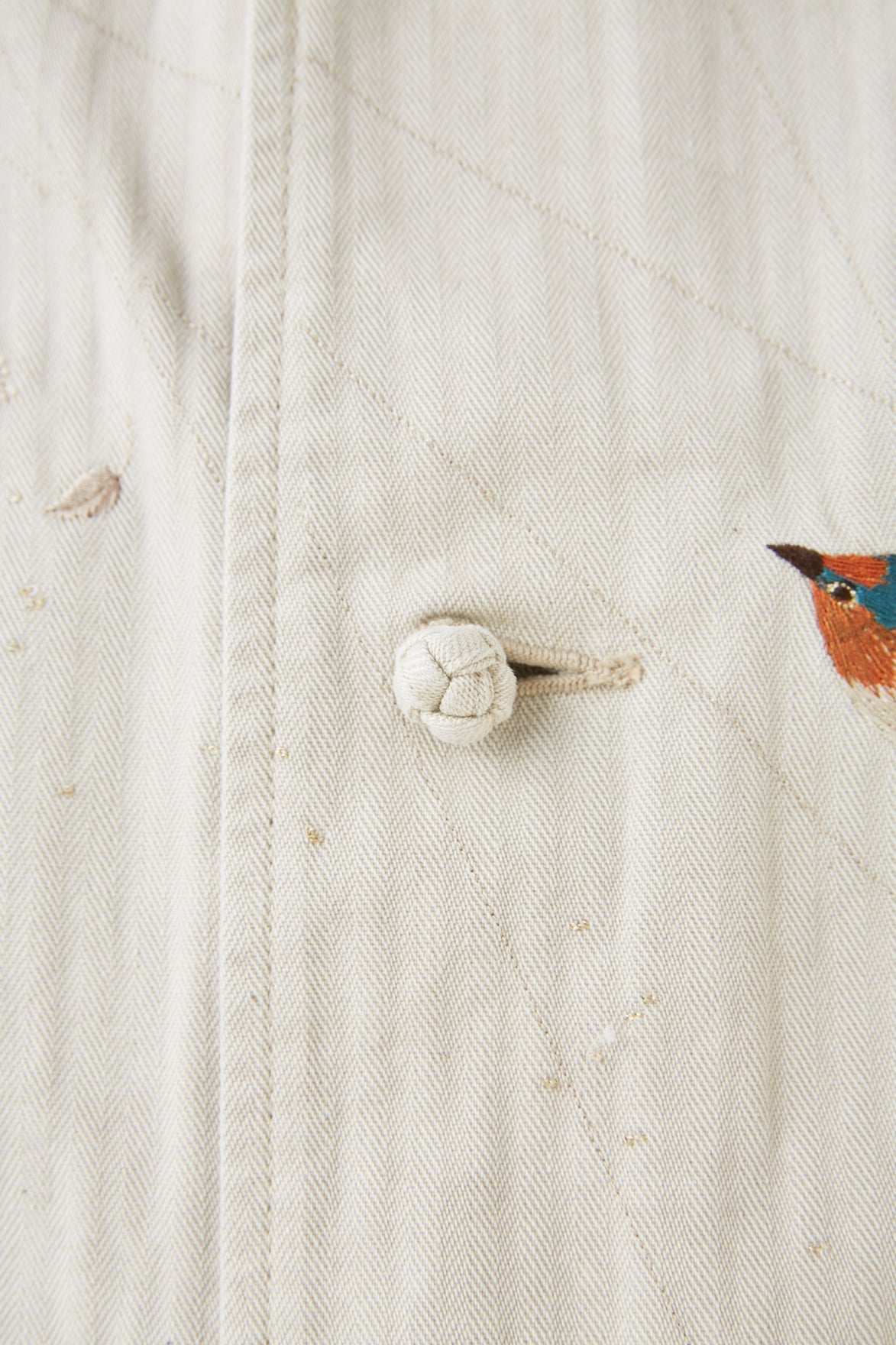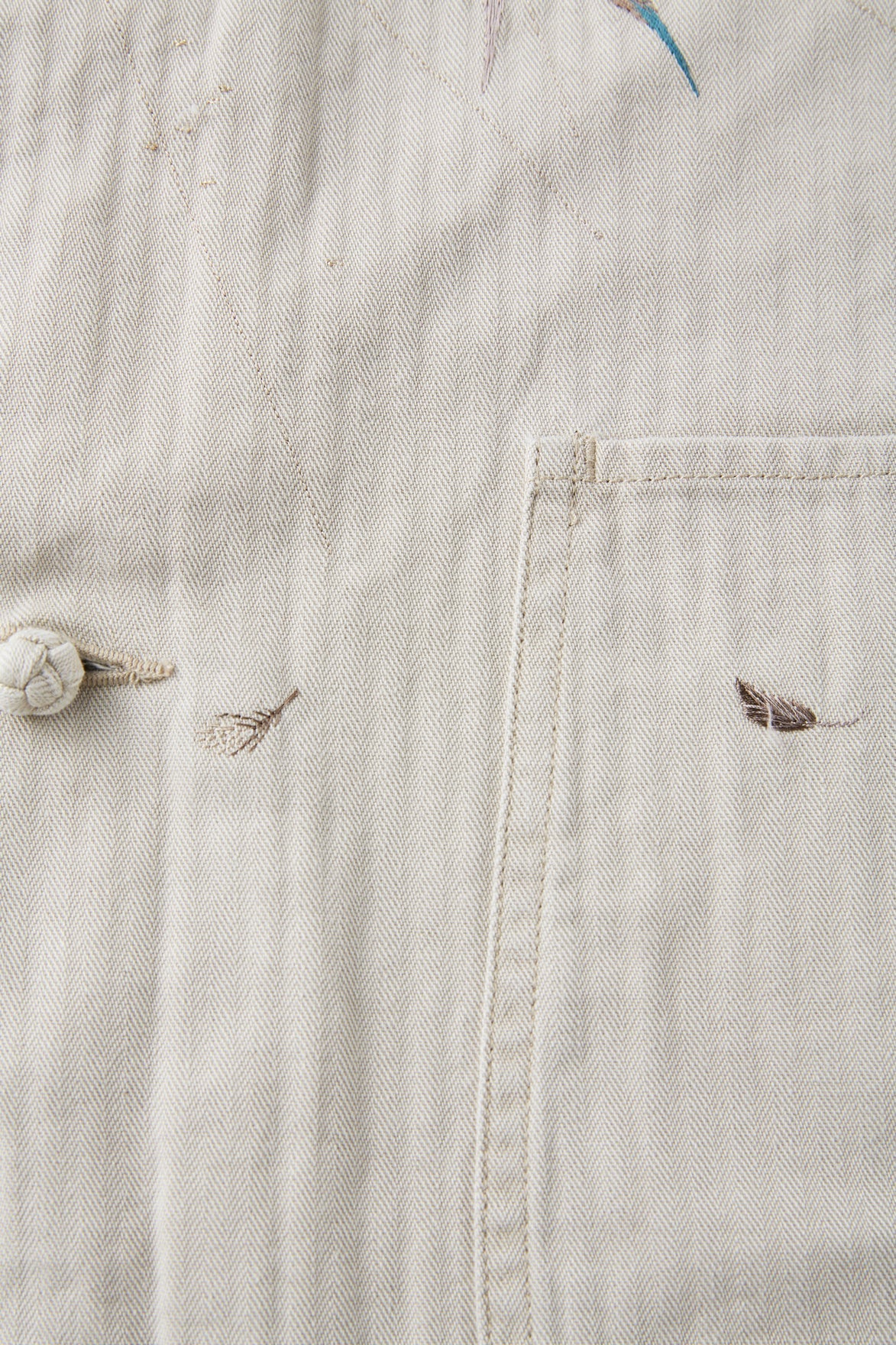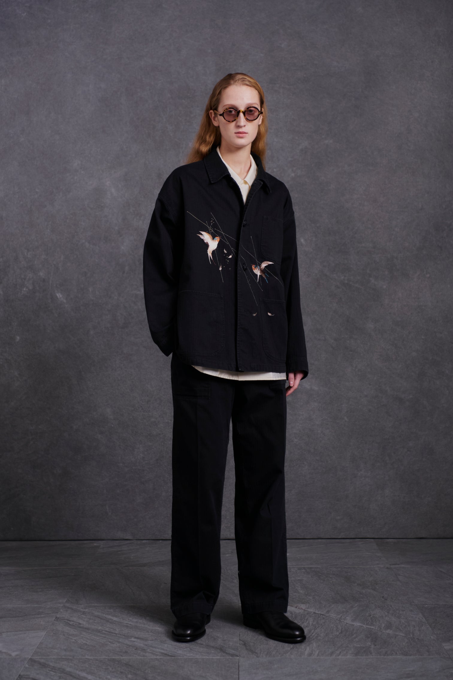 This jacket is decorated with beautiful Japanese embroidery. which will become our new essential piece. This souvenir jacket has a unique and elegant presence. with embroidery that realistically depicts the beautiful old Japanese scenery. following traditional techniques. The scene of swallows flapping their wings in a sudden shower reminds us of the richness of natural scenery that has been forgotten in modern times. It is different from the quality and worldview of the Sukajan embroidery seen in archive pieces. and the elegant expression designed to the limit in terms of thread thickness. number of colors. gradation. and shading is eye-catching. In addition. the cotton herringbone. which is sulfur dyed in original colors and allows you to enjoy the changes over time. has a refined sense of decay unlike the colors seen in archive pieces from the 1940s. and you will be able to feel the duality of wabi and sabi. and elegance.