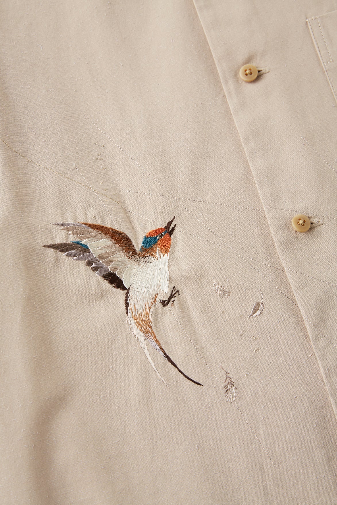 A series of beautiful Japanese embroidery designs that will become our new essential pieces. Following traditional techniques. this souvenir shirt has a unique and elegant presence with realistic embroidery of beautiful old Japanese scenery. The scene of swallows flapping their wings in a sudden shower reminds us of the richness of natural scenery that has been forgotten in modern times. It is different from the quality and worldview of the Suka shirt embroidery seen in archive pieces. and the elegant expression designed to the limit in terms of thread thickness. number of colors. gradation. and shading is eye-catching. The material also has eye-catching neps unique to raw silk thread. giving it a primitive yet modern appearance. The material is a sustainable cotton silk that combines organic cotton grown in Turkey with recycled silk spun using a by-product (boulette) from the silk spinning process. It has a moderate firmness and silk blend. but is characterized by neps with a vintage feel.