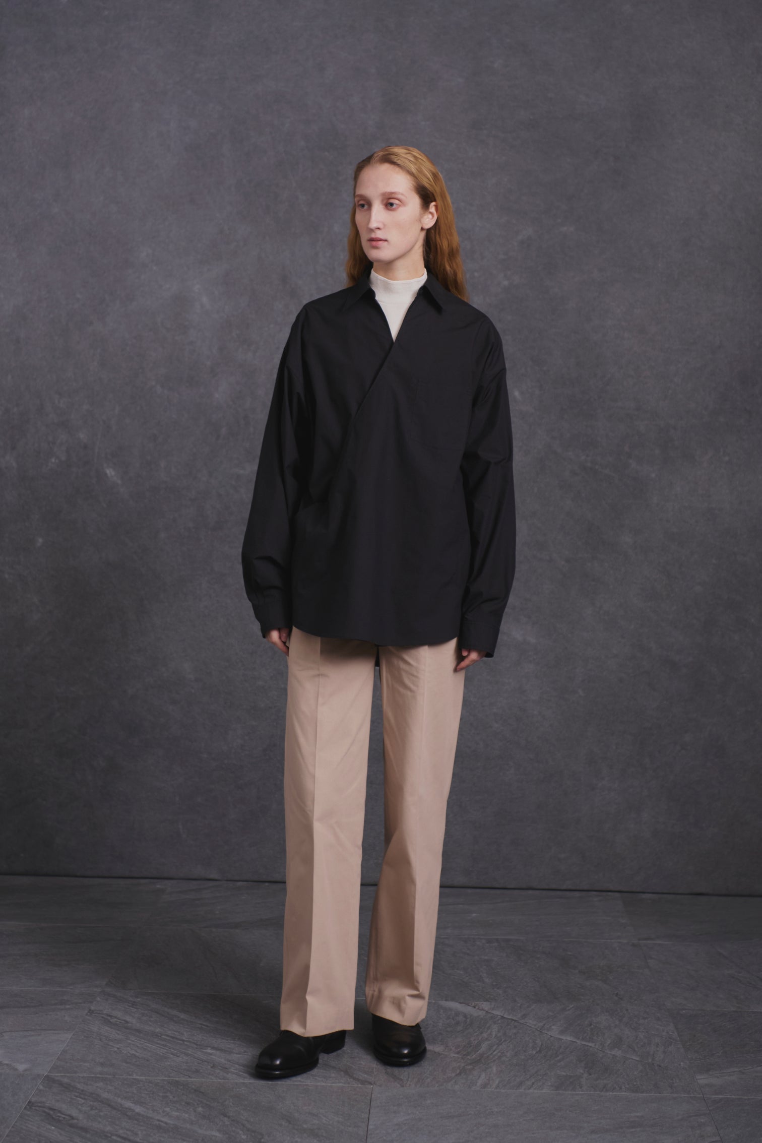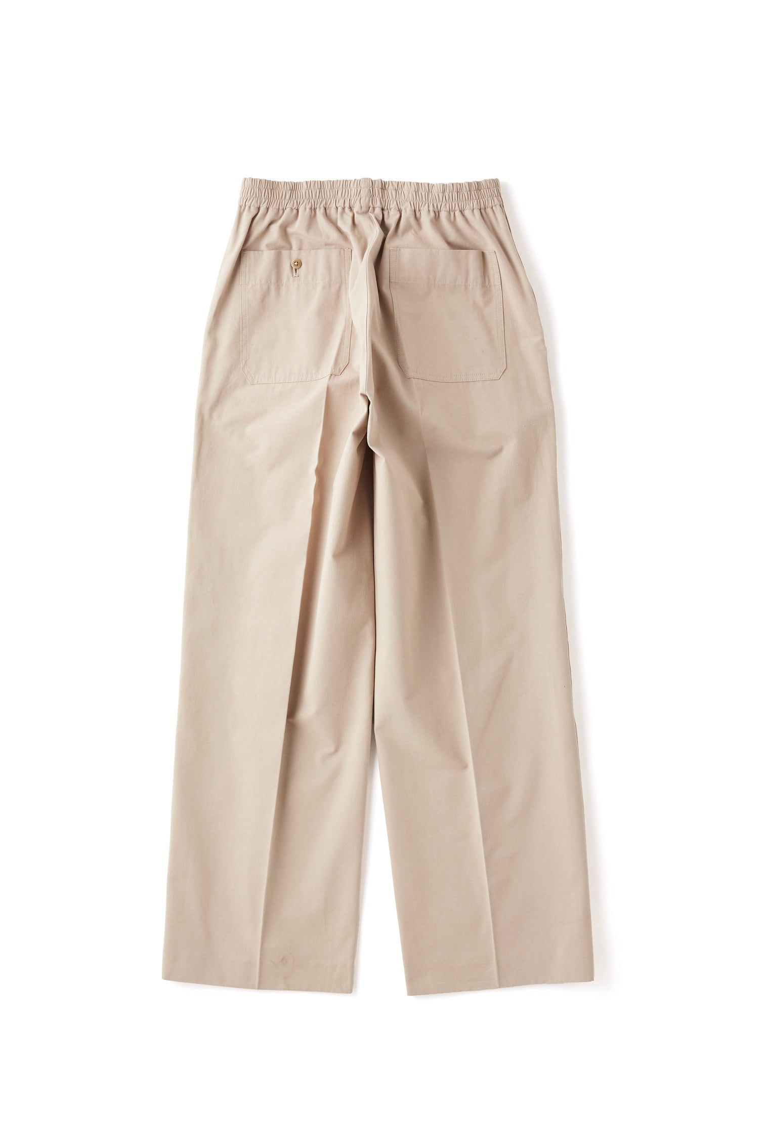 These easy slacks can be worn without a belt. designed to resemble mid-century archive pieces. The back has a gathered waist. while the front has pleats and creases. so they are not too casual. and since there are no belt loops. they look beautiful even when tucked in. They can be paired with a souvenir shirt. The material also has eye-catching neps unique to raw silk yarn. giving it a primitive yet modern look.