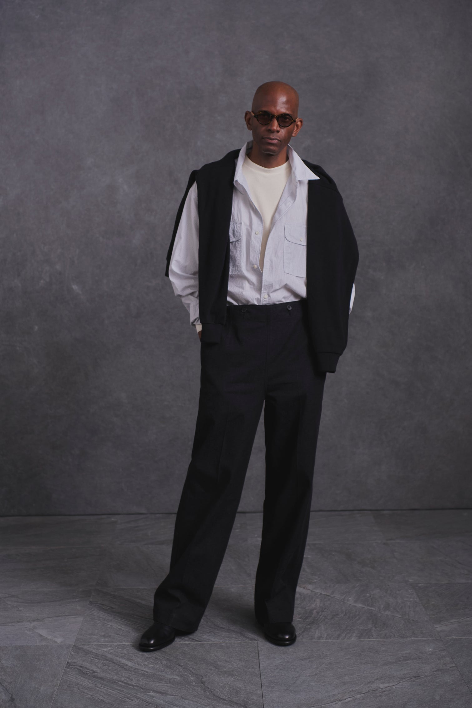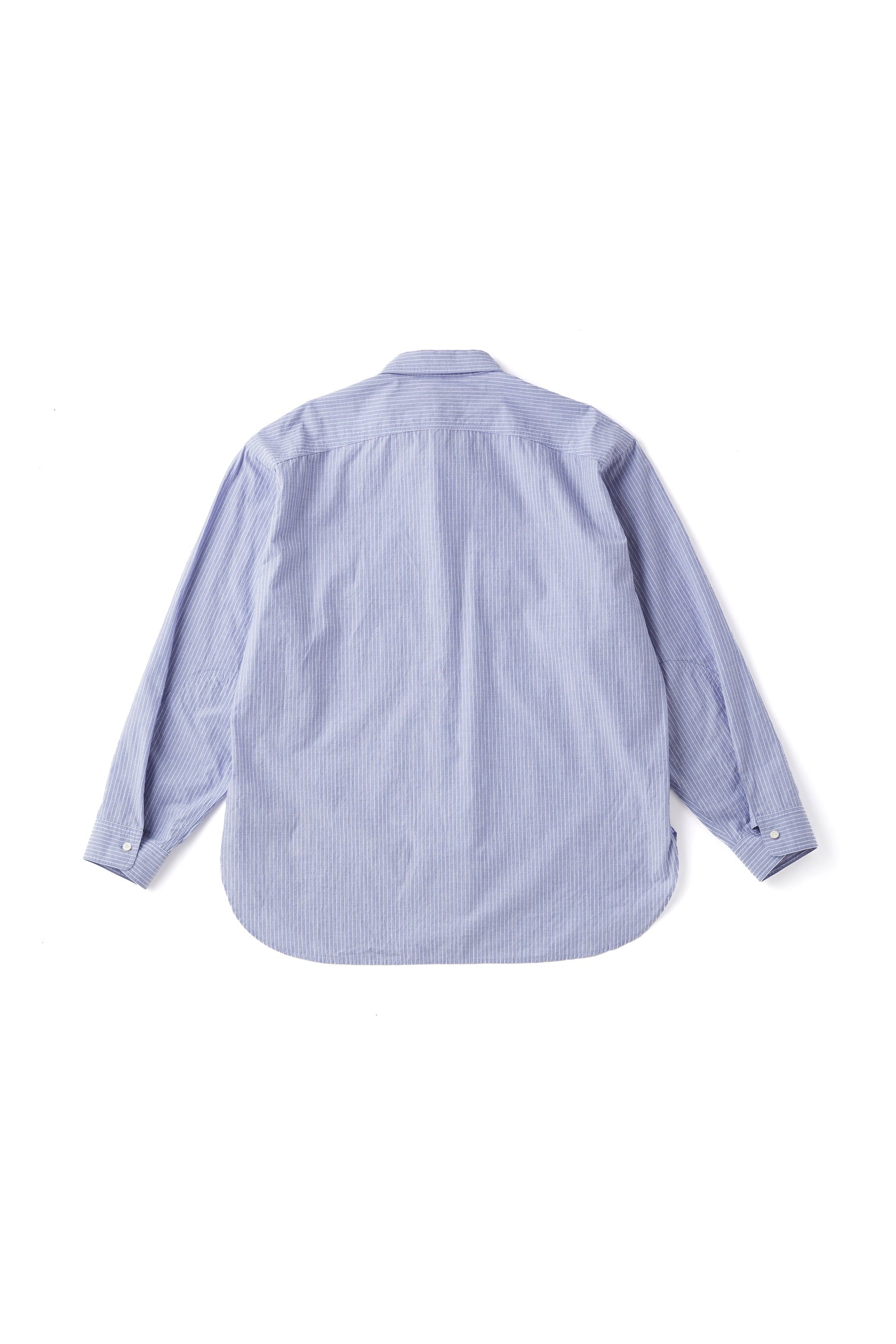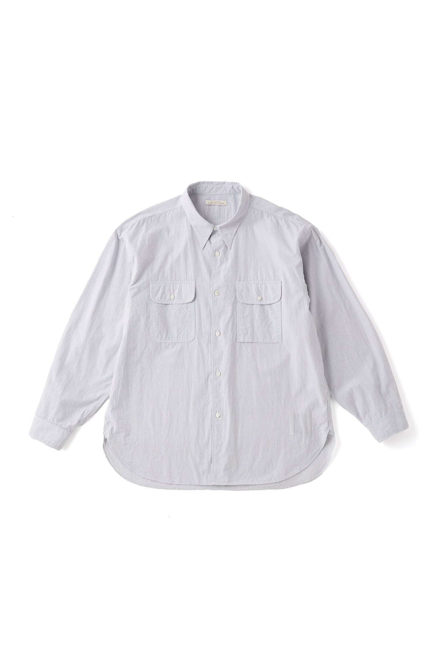 Inspired by the worker uniforms of the mid-century period. An updated gentleman's shirt typical of OLDJOE. based on a simple and sturdy work shirt. The long pointed collar reminiscent of the time. the unique cigarette pocket that is designed not to touch the skin. the simple yet practical cuffs without any rags. the triple stitching and elbow patches. and other eye-catching details have been intentionally left as they are in the design.