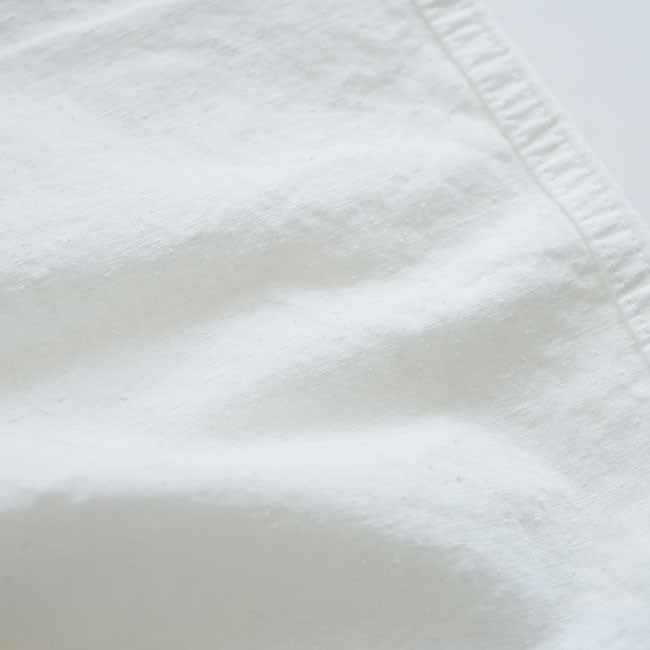The pants were produced with a wide silhouette and characteristic front pockets. based on the motif of the pants used by the mountain troops of the French army. The silhouette is quite wide in the OASLOW range. and the pants are quite voluminous when worn. The motif of these trousers is that they are overpants. so they are produced with a drawcord at the waist and a wide silhouette as it is.