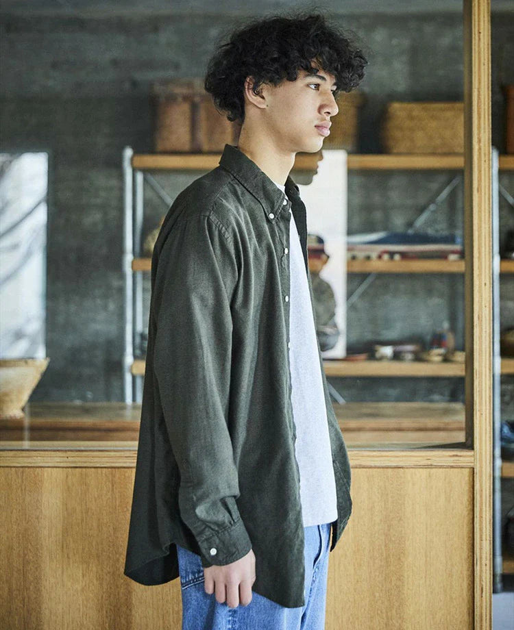 The silhouette is looser than our previous button-down shirt.