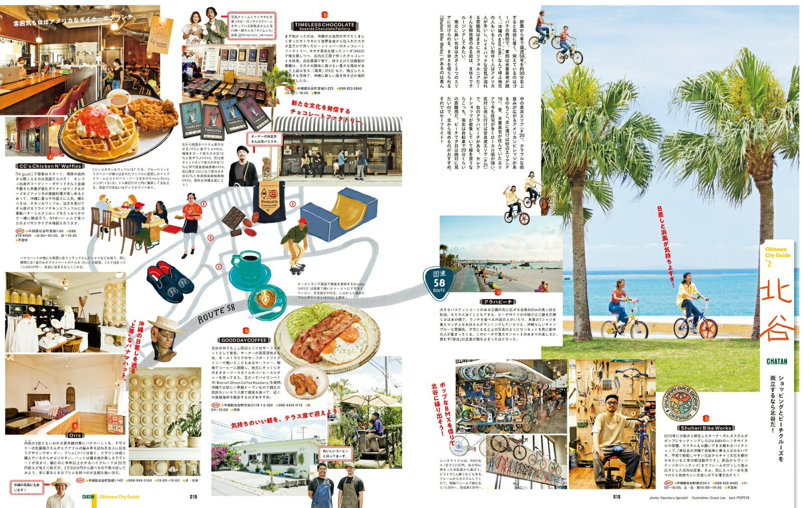 I had an itch to wander through some distant city. so without hesitation. we headed to Okinawa. A friend who loves the southern islands was all for it. saying. “Now's the time to go.â€?Beaches? Soki soba? My mental map of Okinawa was still blank. With an ocean that turns into an aquarium the moment you dive in. and a northern half that's a UNESCO World Heritage site. there's plenty to explore. Steak. tacos. South Indian curry—everything I heard about the food was delicious. If it's all true. then this island is a dream. and we just had to see it for ourselves. This book is POPEYE's map of Okinawa. crafted from our days of eating. swimming. and exploring. As always. we walked with a sense of respect for the places we visited.