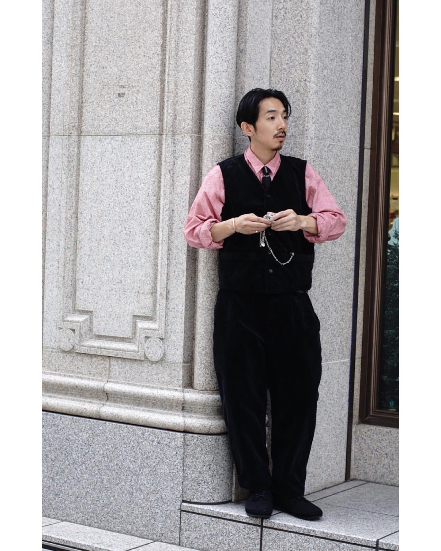 The classic jacket and classic pants. made from fabric by Brisbane Moss. a prestigious corduroy manufacturer. are back for the first time in several years. Some of you may have been waiting for this! The fabric is firm and crisp. so the details are emphasized and the impact is great when you wear the top and bottom together. The classic pants are my favorite style among PC pants. This is a beautiful piece with a tapered fit from the thigh to the hem.