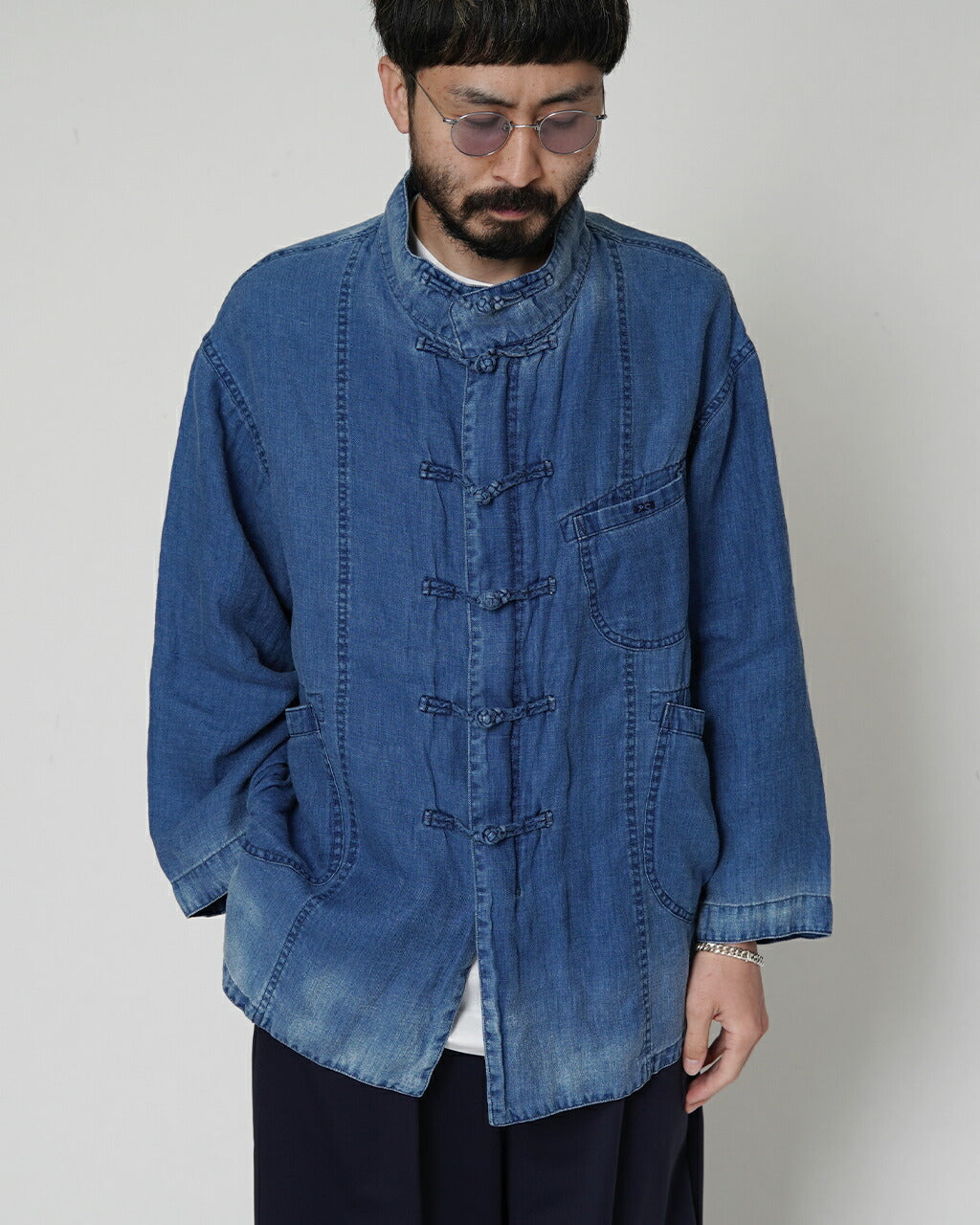 A familiar and popular Chinese design jacket for PCs. This item is made of linen dyed with indigo. and at first glance it looks like denim. but the texture is just like linen with a refreshing feel. In addition. careful processing has recreated the tasteful vintage atmosphere.