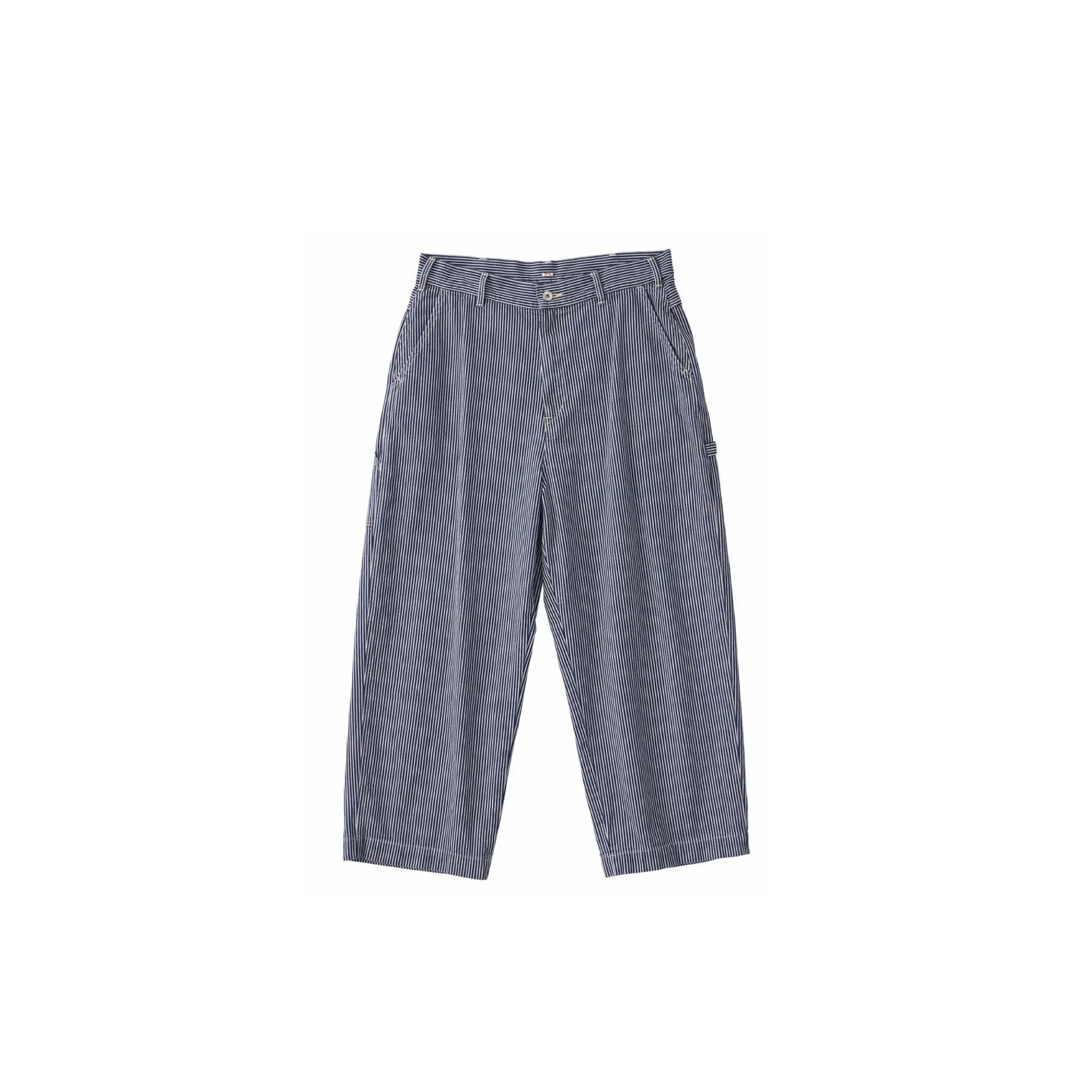 A refreshing STEINBECK HICKORY. In order to approximate the rough feel of vintage denim. short pitch slub yarns (threads with uneven surfaces) are randomly used in the warp yarns. It's lightweight at just 10 ounces. so you can wear it easily even in the summer. PAINTER PANTS have an attractive wide silhouette.