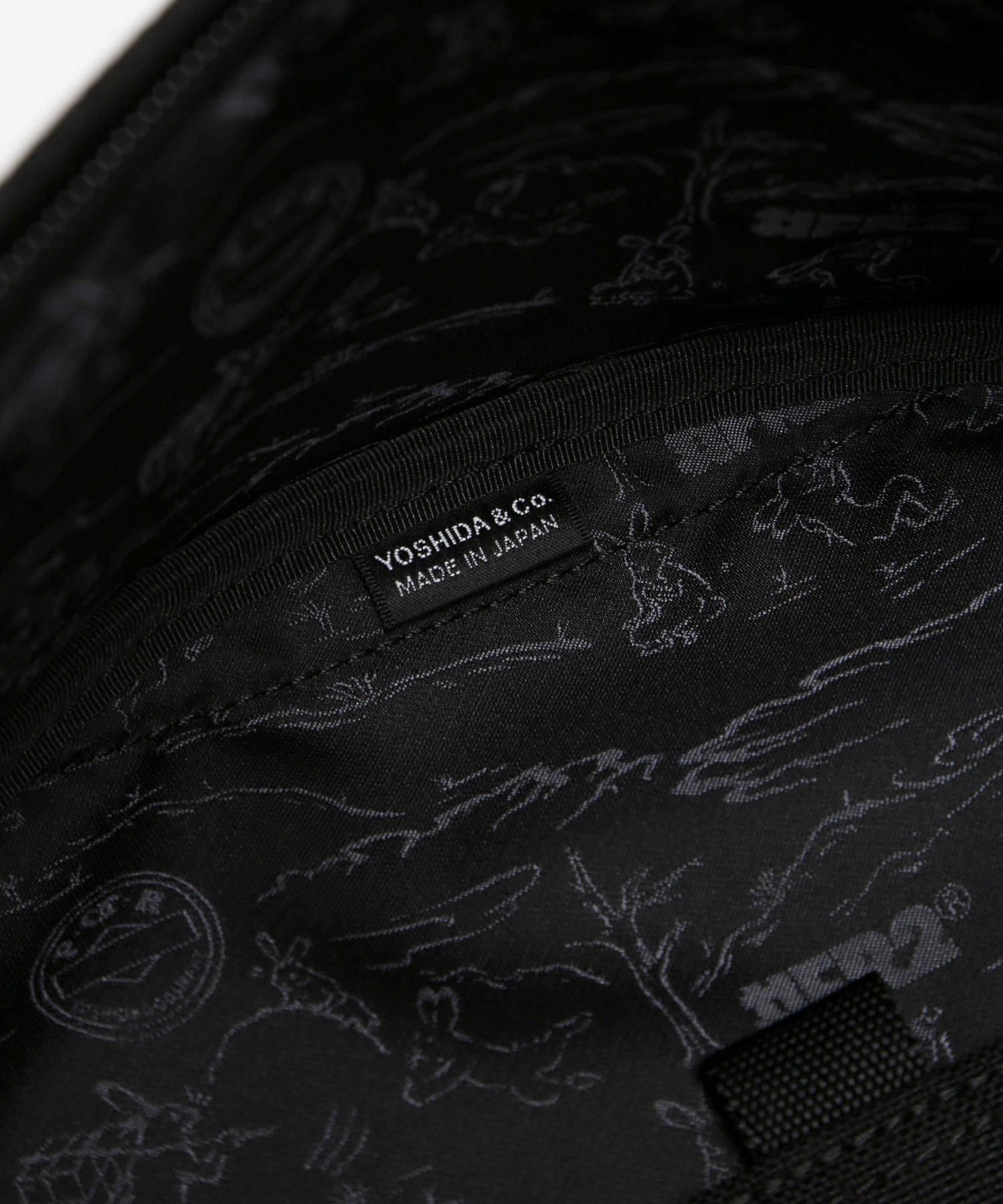 The main material is all-black nylon fabric. and the lining has an original pattern designed for this project. giving the bag a strong finish when opened. In addition to the main compartment. there are side and front pockets. an inner divider pocket. and a zip-open pocket with mesh on the inside on the back to store a PC. making it a highly functional item.