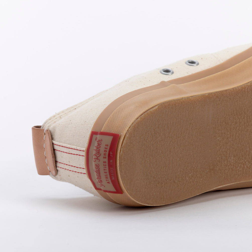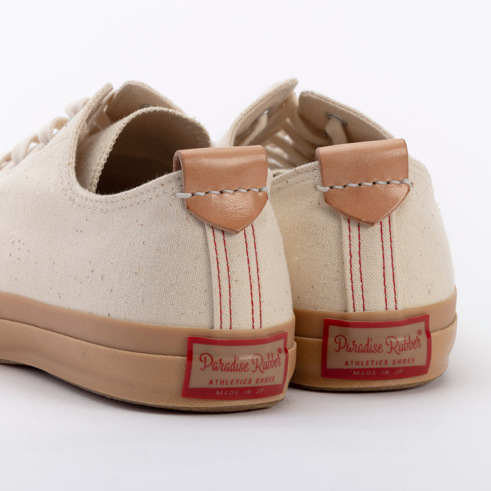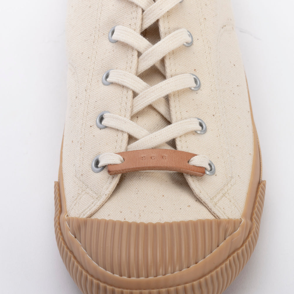 The natura-colored leather parts. which go well with the kinari canvas. were made by Mr. Kanayama of SUNSET CRAFTSMAN Co. This is a very time-consuming and labor-intensive craftwork sneaker. with every step of the process. from cutting out the parts to finishing the Koba (cut corner) and sewing them onto the sneaker. being done by hand.