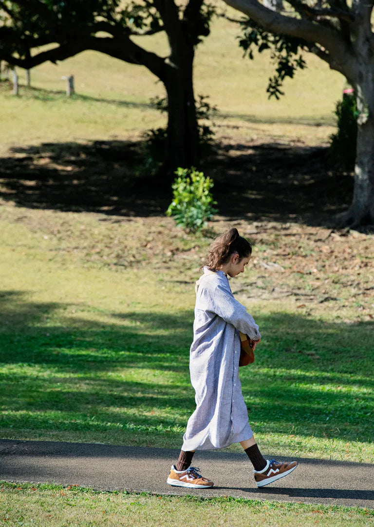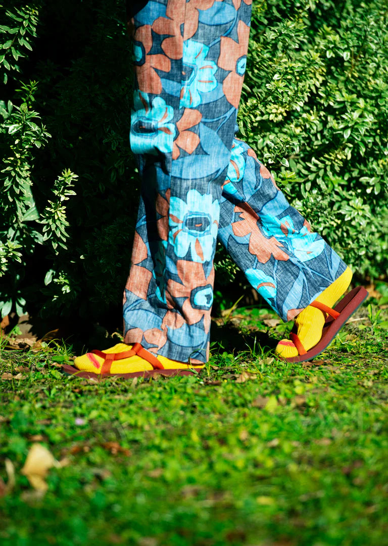 These chunky organic cotton ribbed socks are knitted with an old-style low-gauge knitting machine that only a few craftsmen can operate. The eye-catching coloration is inspired by outdoor wear made in the 1980s and 1990s. The fabric is thick and tough. but also has excellent breathability because of the chunky stitches. Each pair goes well not just with sneakers but also with sandals.