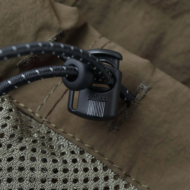 The silhouette can be adjusted by tightening the adjustable drawstring at the hem. The material is matte nylon taffeta with a washer finish. It is also water-repellent. so you can wear it with peace of mind even in light rain. The lining is made of mesh material that has high sweat processing properties and keeps the surface comfortable against the skin.