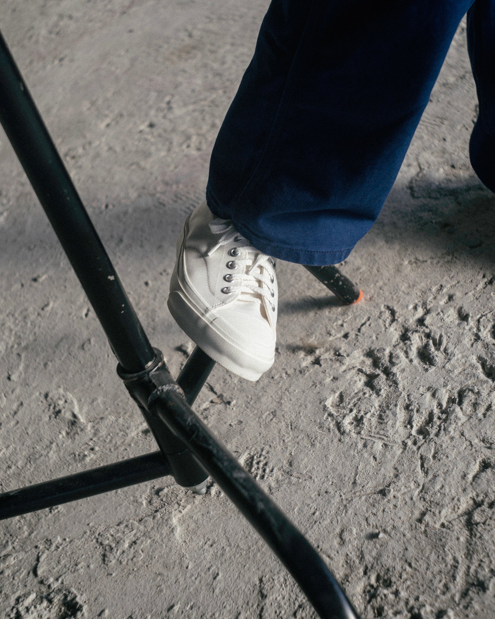 Following the 2023 Oxford model "Milk". which was inspired by badminton shoes. the motif of this model is based on the tennis shoes that have a deeper history and have been around since 1915. The anonymous upper design with single stitching created in 2017 and the upper material (high count twill) are maintained. and only the rubber (foxing tape) around the toe guard and sole has been changed to create a similar but different impression. The toe guard. which has a total of five layers. is constructed using rubber of different thicknesses. pursuing the shape of a primitive court shoe.