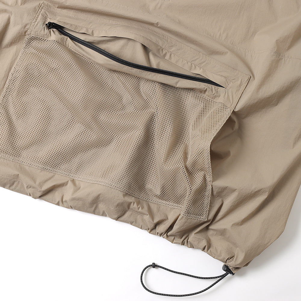 HALF ZIP CREW SHIRT features a wide silhouette with a large mesh pocket on the front. A drawcord is attached to the hem. so you can arrange the silhouette. The material is 20D nylon. which is ultra-lightweight. highly water-repellent. and has high stretch fabric. Although it uses thin threads. it has a high density. so it is a material that has a unique firmness and high-quality appearance.