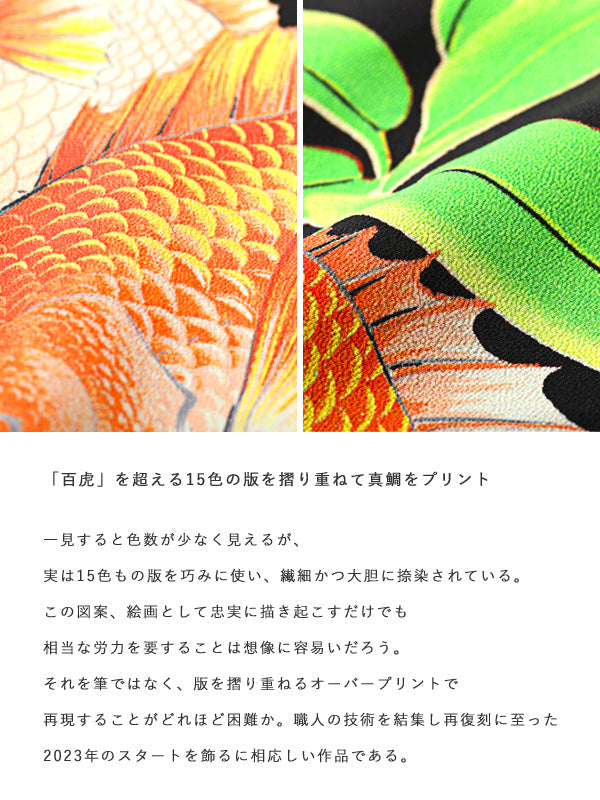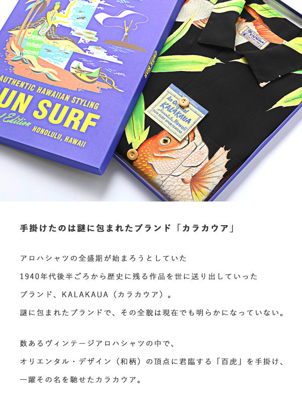 KALAKAUA is a Hawaiian shirt brand that had released historical works since the late 1940s. Although the detail of the brand has yet to be revealed. SUNSURF has continued to research it in Hawaii for more than 20 years. The one of the most famous works it created is "Hundred Tigers" which we could regards as a representative of Hawaiian shirt with Japanese patterns. The "Red Snapper" is also one of such works. Lively red snappers are delicately and boldly printed on the colorful rayon fabric by skillfully using 15 colors of intricately carved screens. Among the many Aloha shirts that we have collected so far. this is a masterpiece that has the most distinctive and impressive impact.