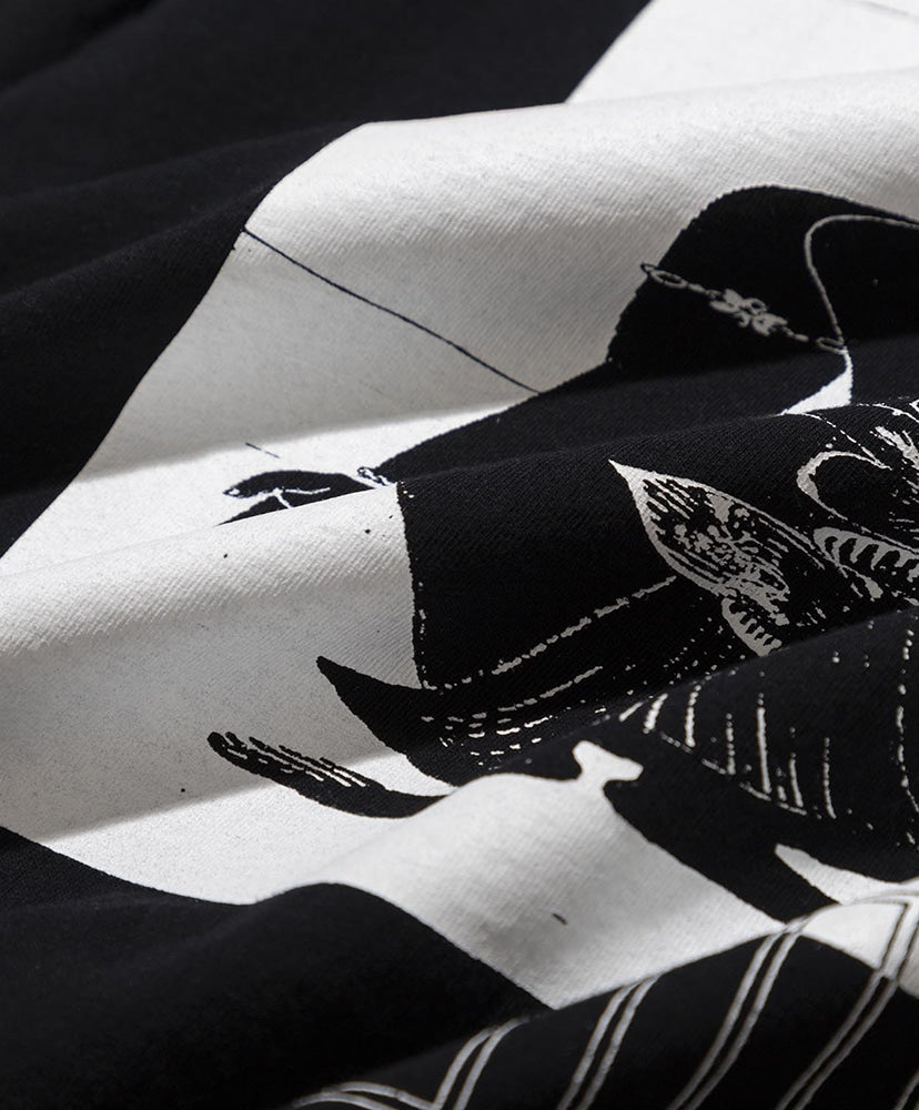This T-shirt has its roots in bootleg T-shirts. which feature the design of the tea bags sold at Rokuroen printed on the back and a catchy slogan printed on the front.