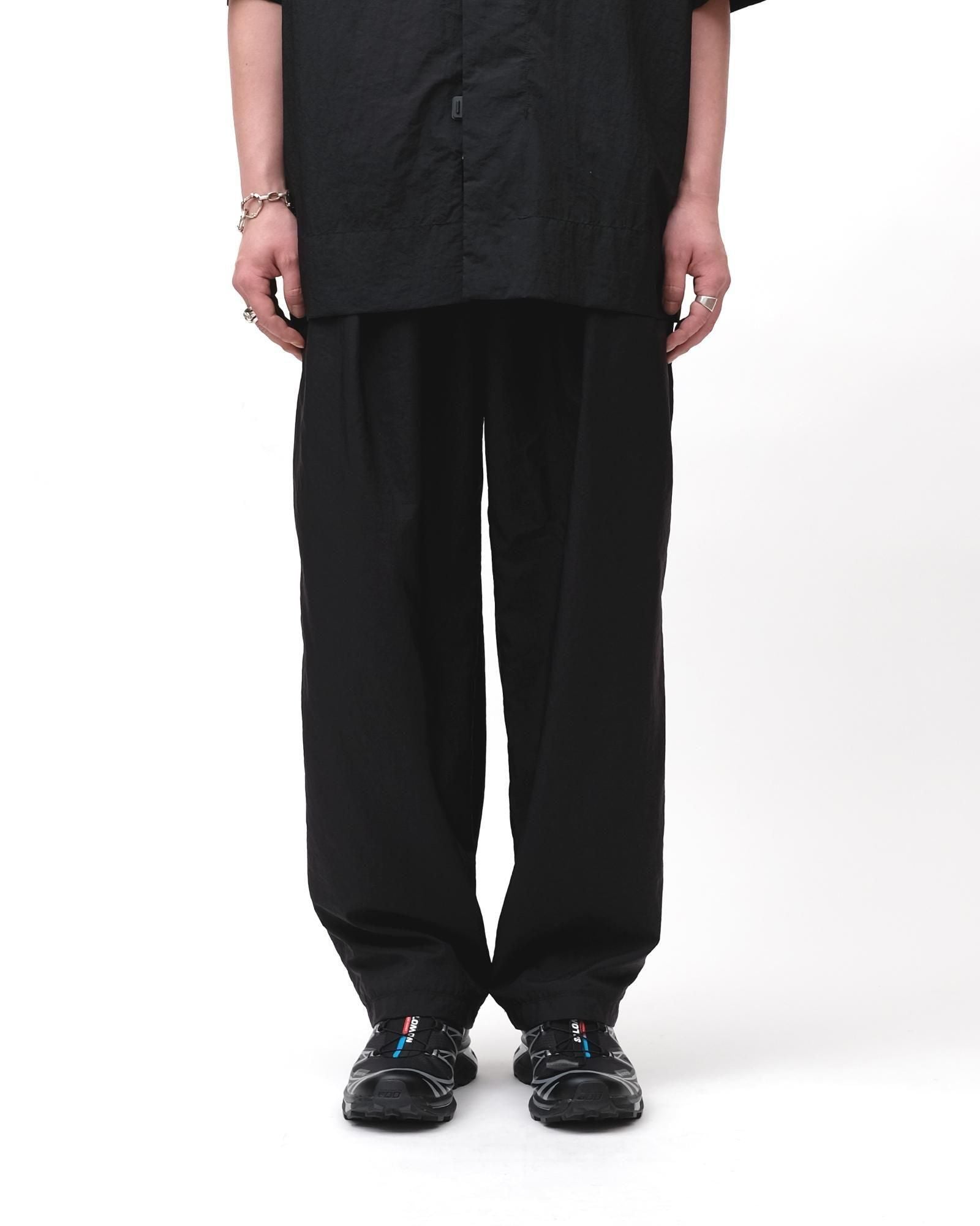 WALLET PANTS RESORT is the widest model among the brand's line. As the name suggests. it is a comfortable and easy-to-wear model that makes you feel like you're relaxing at a resort. The opening and closing part is wide and deep. and the zipper pocket is designed to be the size of a long wallet. making it very practical. Although it has a voluminous wide silhouette. the tapered silhouette and tucks at the waist make it an easy-to-style model that is recommended for those who are not good at wearing wide pants.