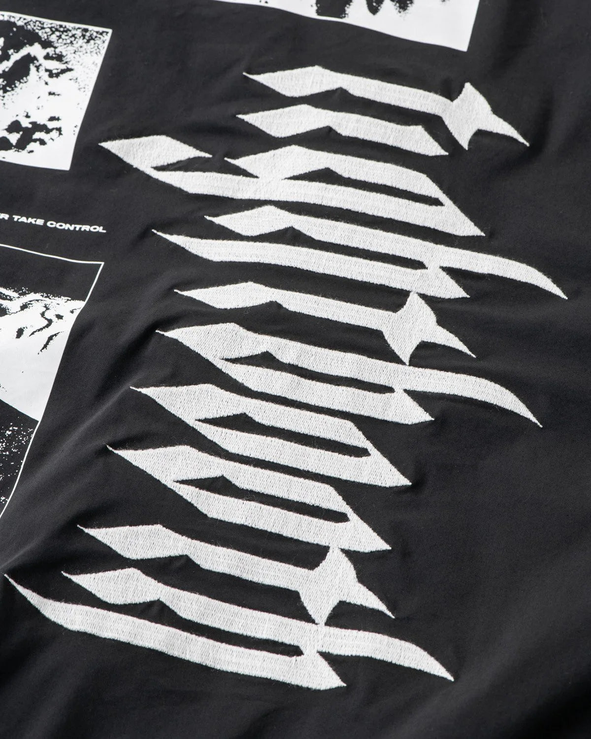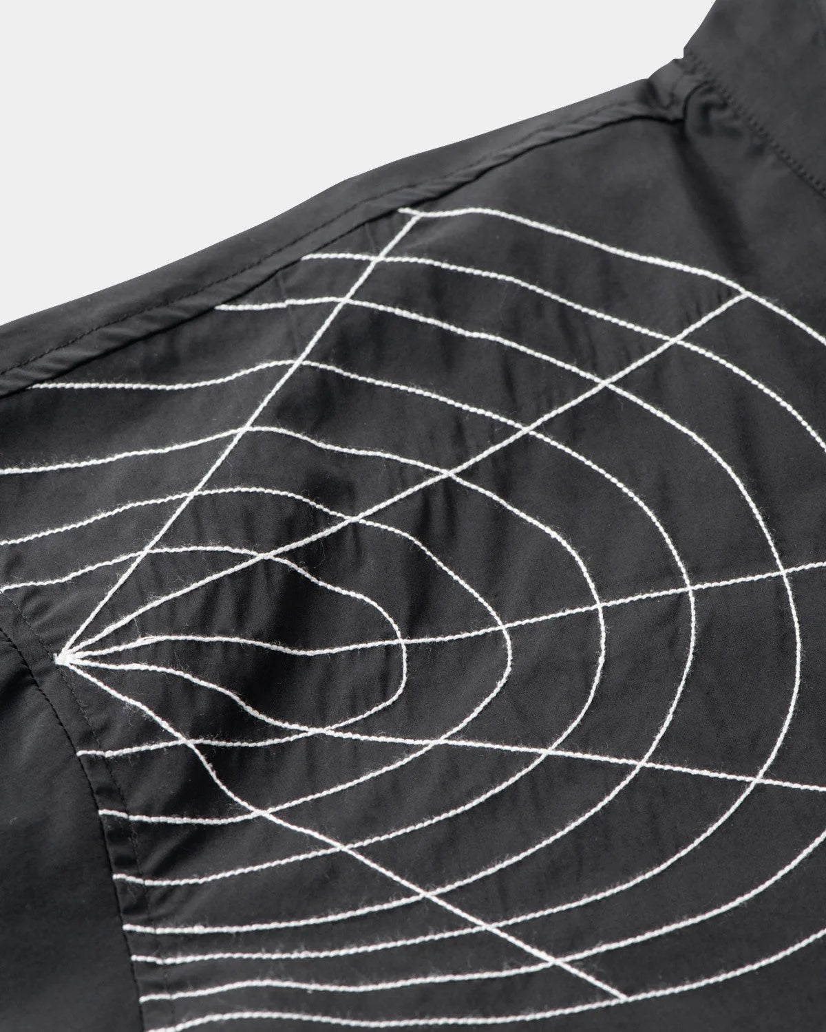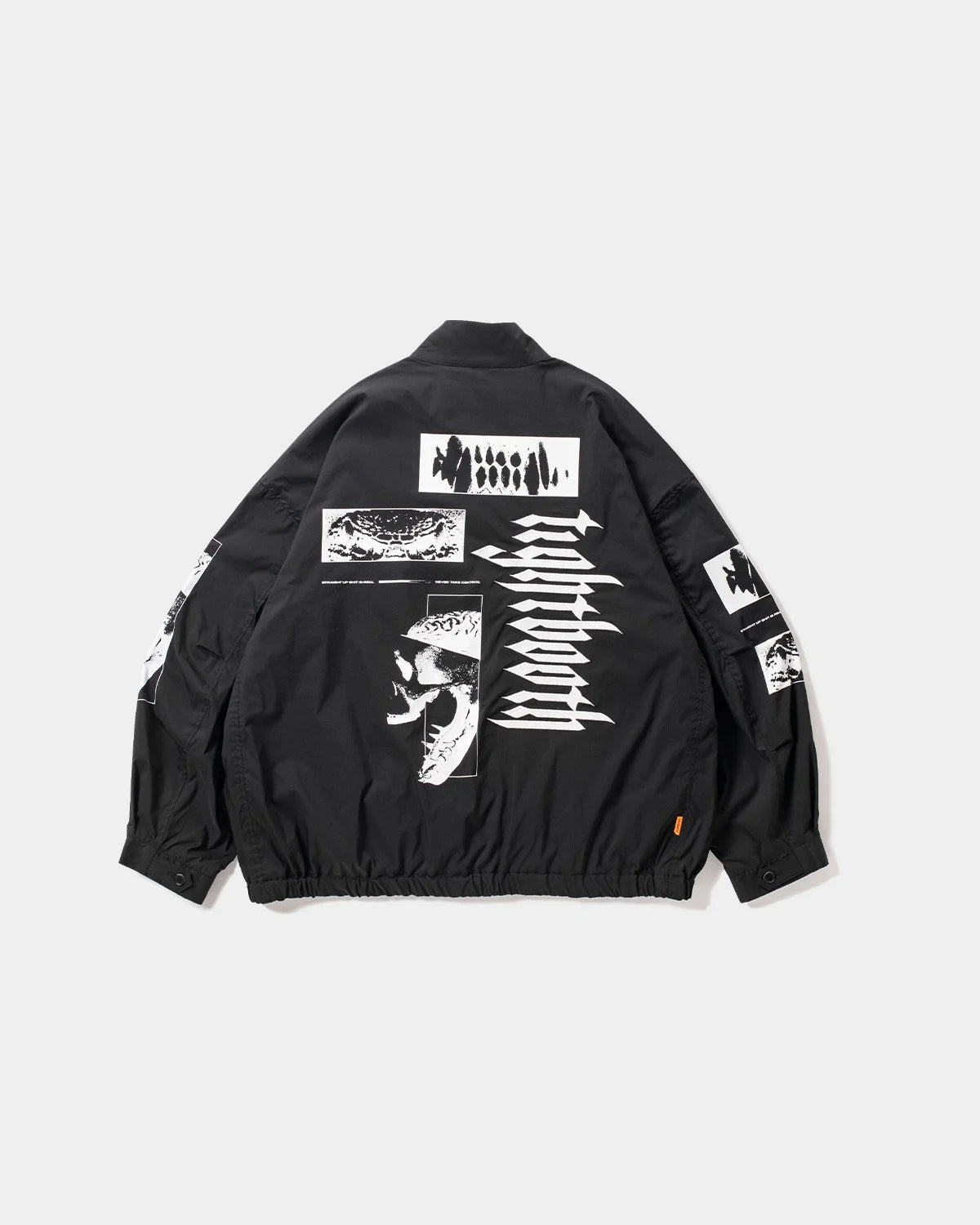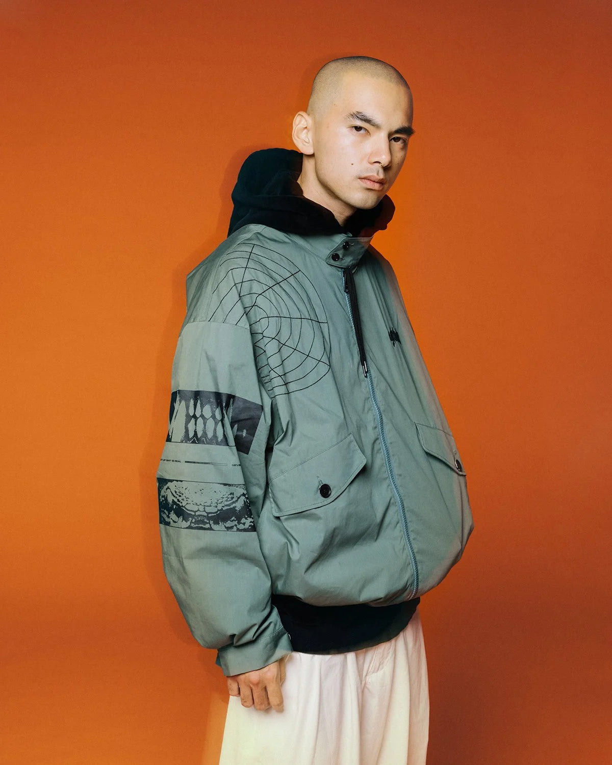 The front has a double zip design. with a logo embroidered on the left chest and a spider stitch design on the right shoulder.