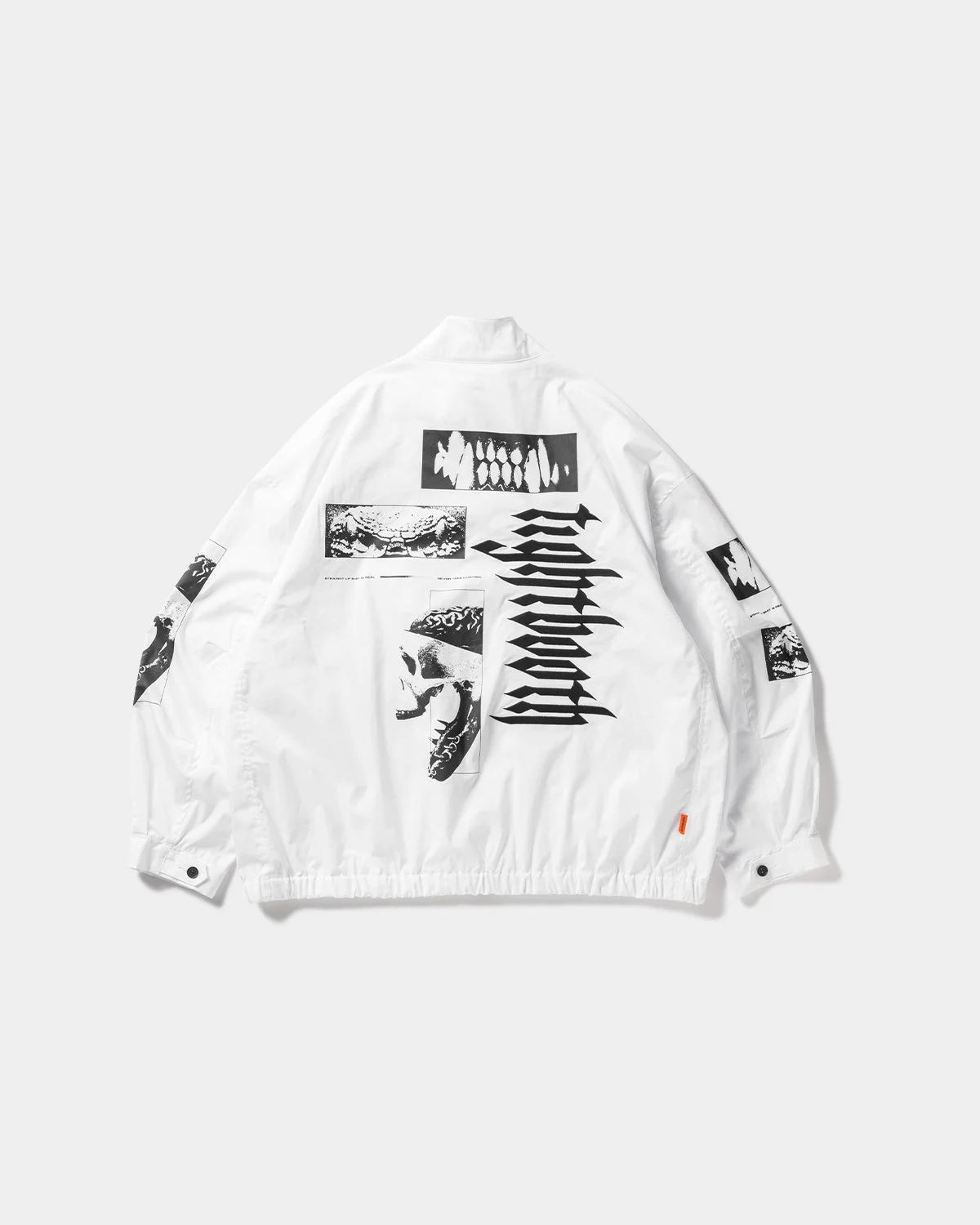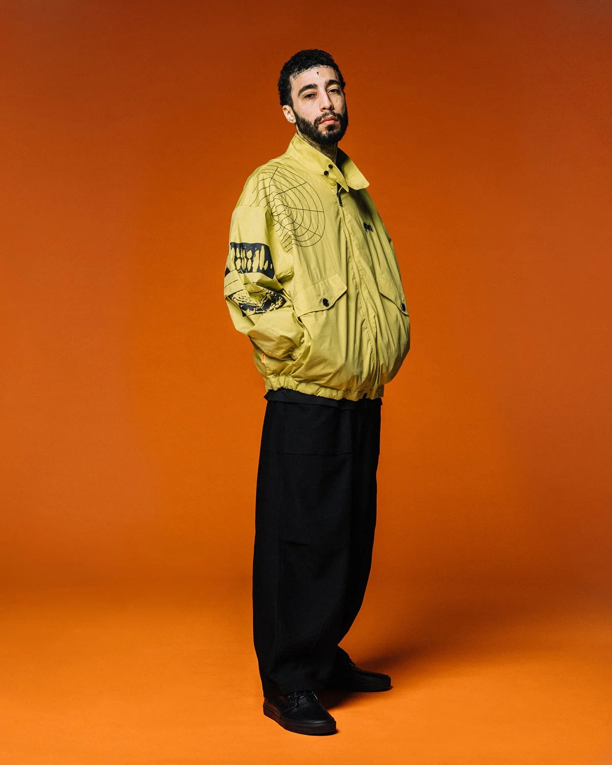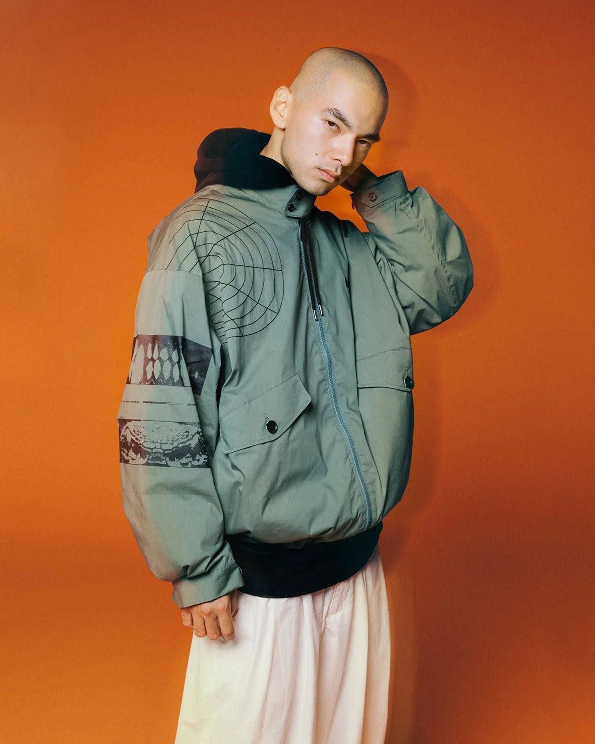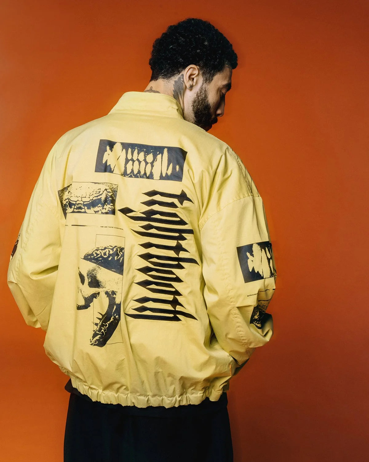 The front has a double zip design. with a logo embroidered on the left chest and a spider stitch design on the right shoulder.