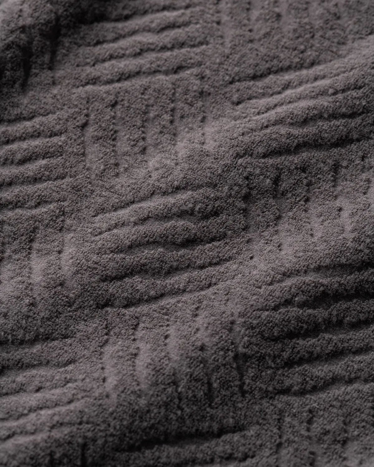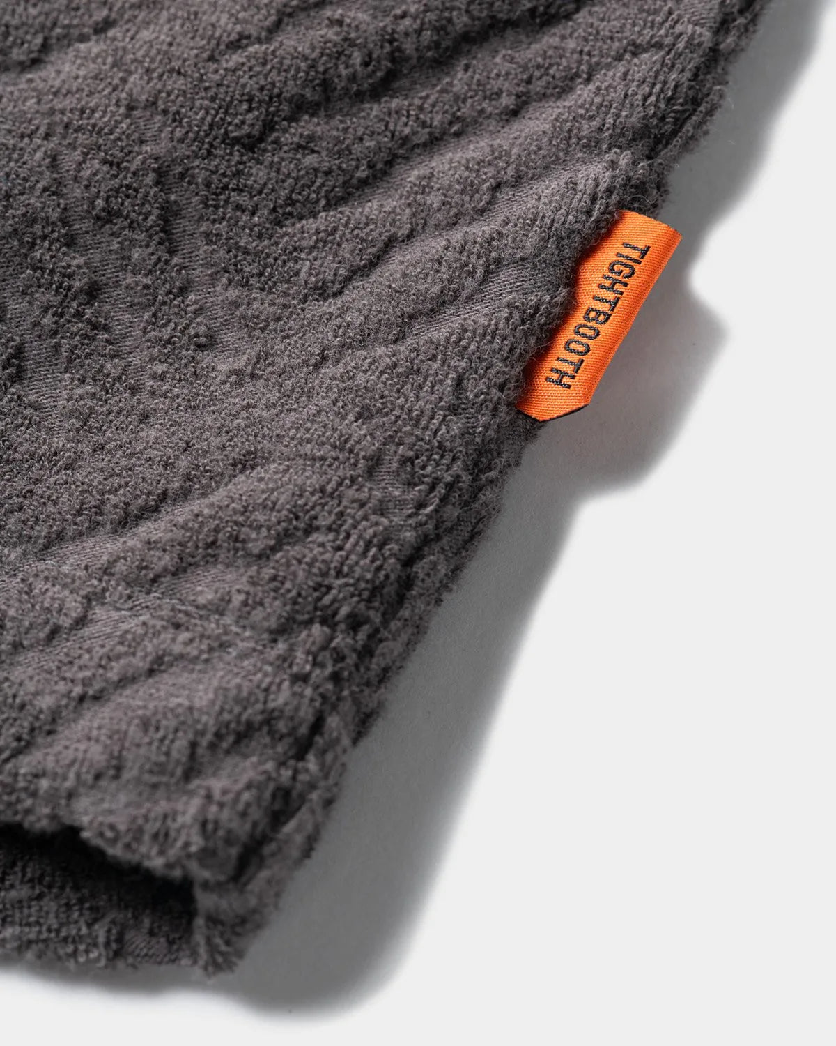 A cut and sew piece of original fabric that expresses the checker plate (striped steel plate) used as a section during street skating with terry jacquard.