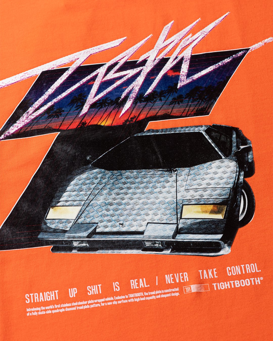 A T-shirt printed with graphics of a supercar customized with checkered steel plate.