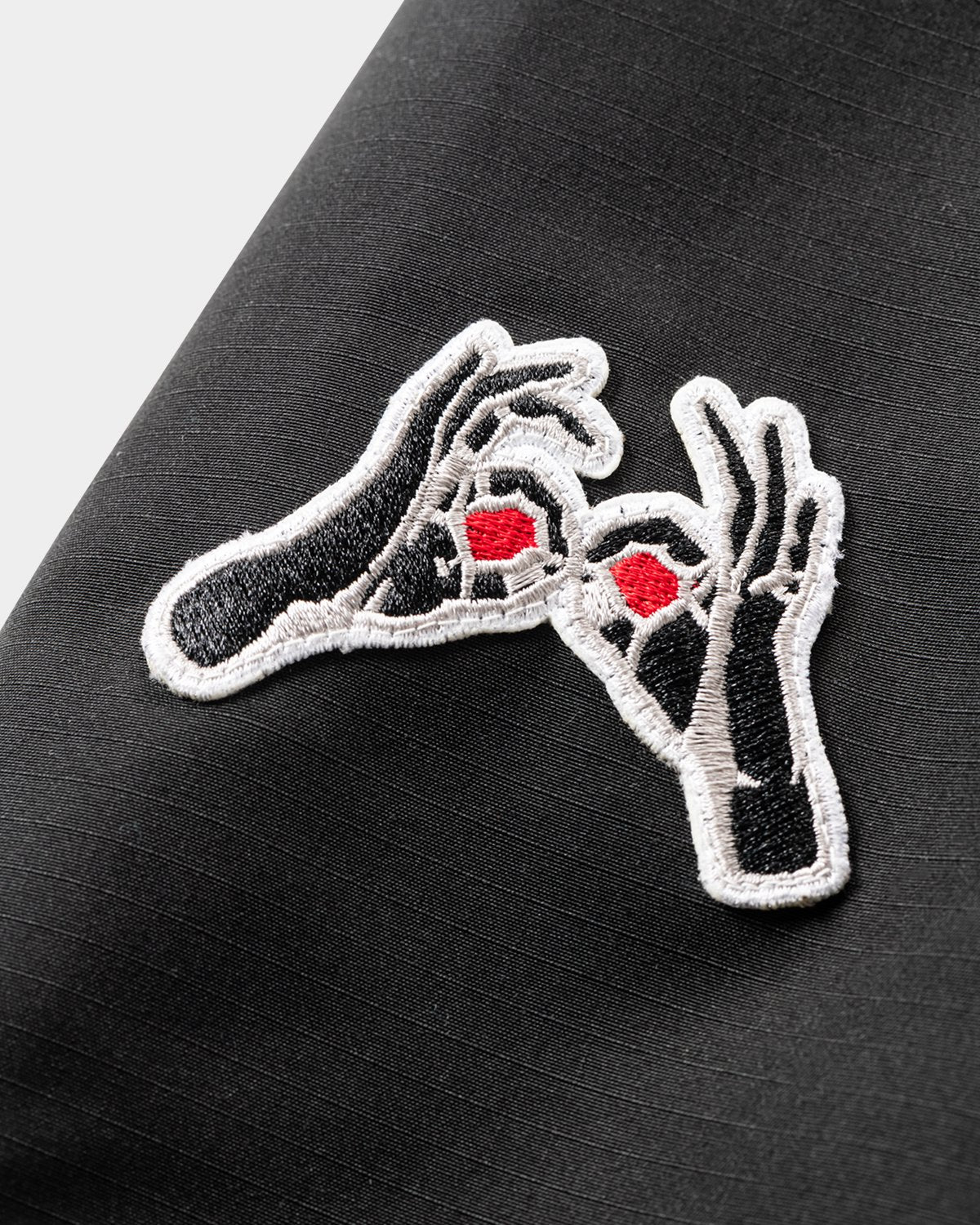 The left sleeve has a patch pocket with a logo. the right sleeve has a hand sign patch. and the cuffs have Velcro adjusters.