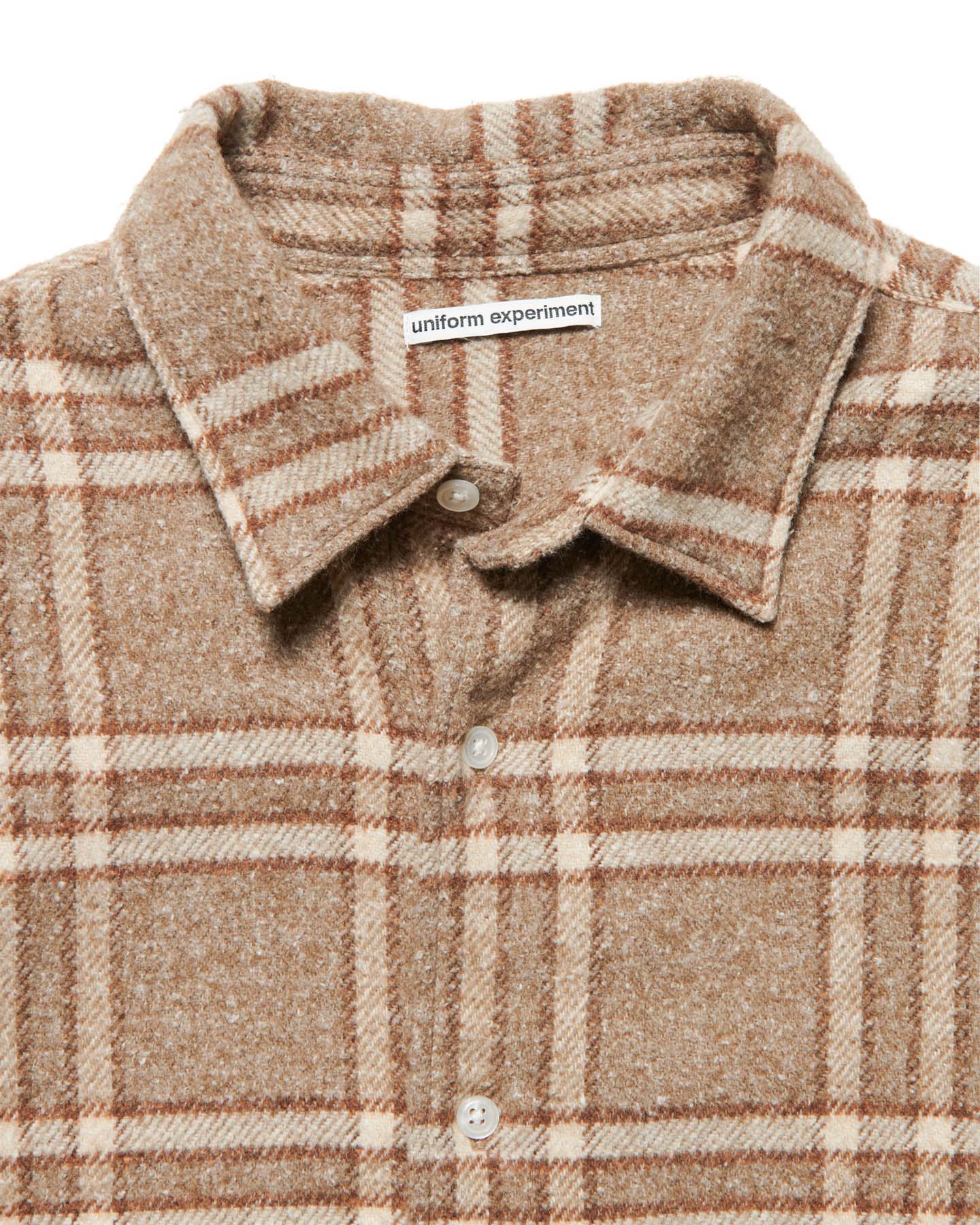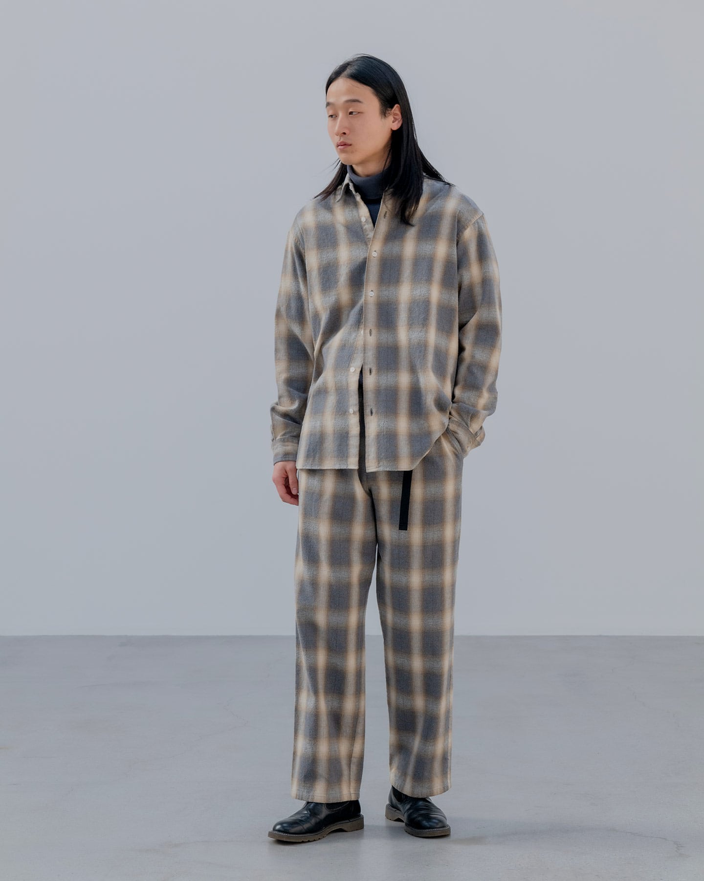 The "FADE" series check shirt. which has become a staple item representing UE. expresses an aged texture. It comes in a wide variety of fabrics and colors. with different patterns used for each color. including shaggy-brushed gray. light gray and sage with a melange touch. light brown made with a cotton-polyester blend. and red made with herringbone fabric. Additionally. this season. pants made with the same material are also available.