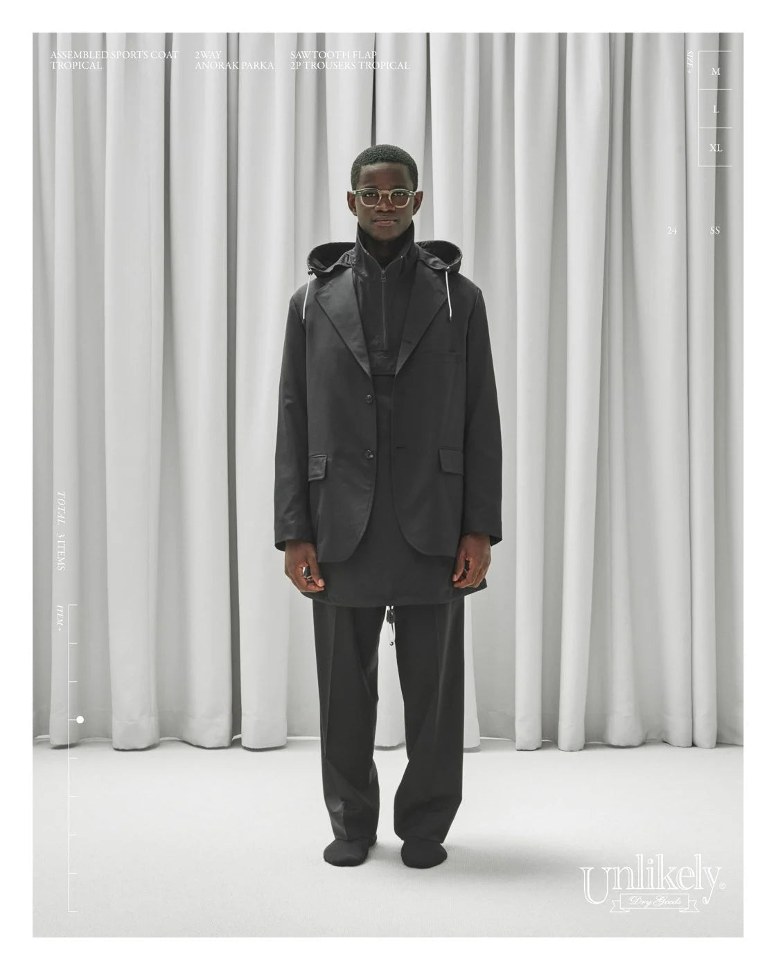 2P trousers are the signature item of the Unlikely brand. The characteristic wool trousers have a deep rise and large hips. and are slightly tapered towards the hem. An unusual feature is that the flap of the coin pocket has a sawtooth design used on cowboy shirts. We have created a pop arrangement that will make you smile when you tuck in your shirt. Like the jacket. one side of the pocket bag fabric is made of polyester mesh fabric to provide breathability.