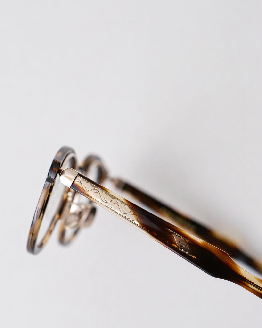 Yellows Plus's rounded Boston-shaped cell frame ELTON. It looks voluminous from the front. but it is made of 4mm thick material. and is lighter than it looks. The back rim is fixed with a titanium part at the back of the front to ensure frame strength. The elegant combination of metal parts. such as the decorative studs on the front side and the delicate pattern on the core metal of the temples. gives it a luxurious feel.