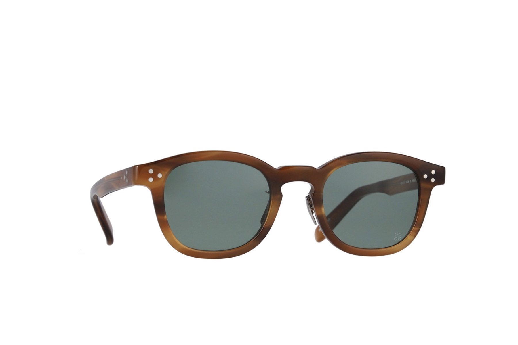 Wellington-style sunglasses with a simple and beautiful shape. Designed to be slightly thick. this model has a moderate presence. While adopting classic details such as a keyhole bridge and three-point studs on the front frame and temples. titanium nose pads and a thin inner temple improve the wearing comfort.