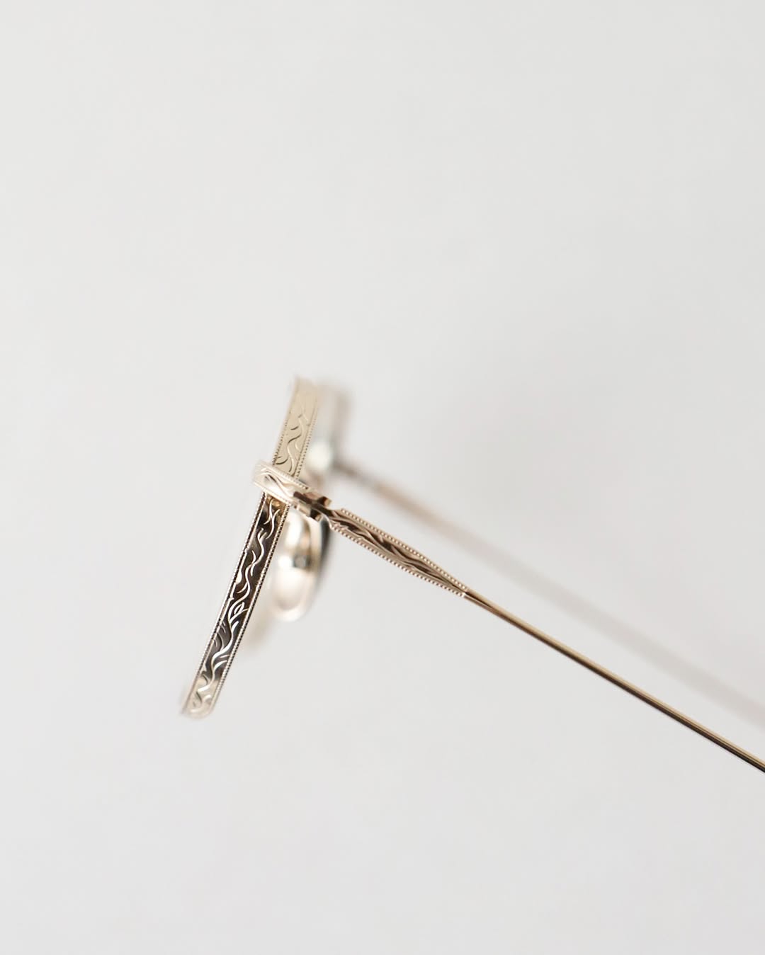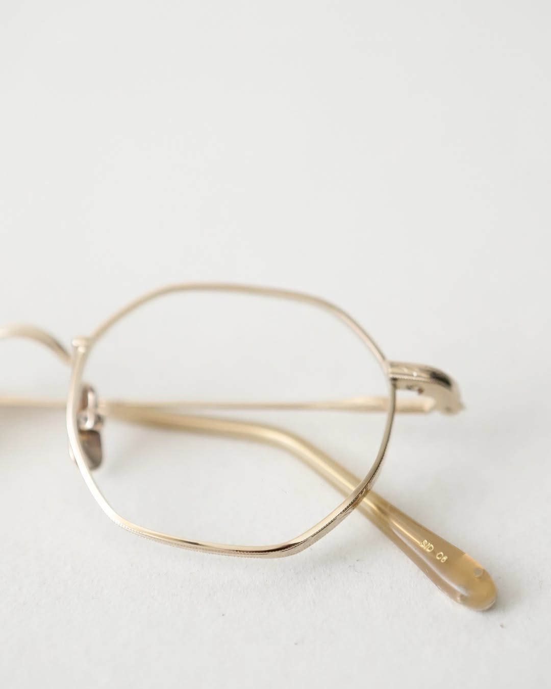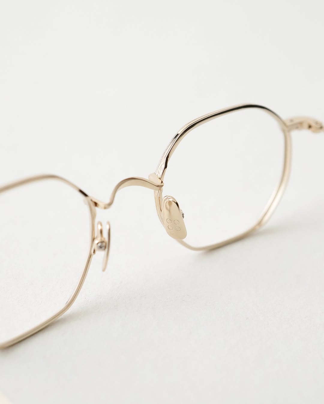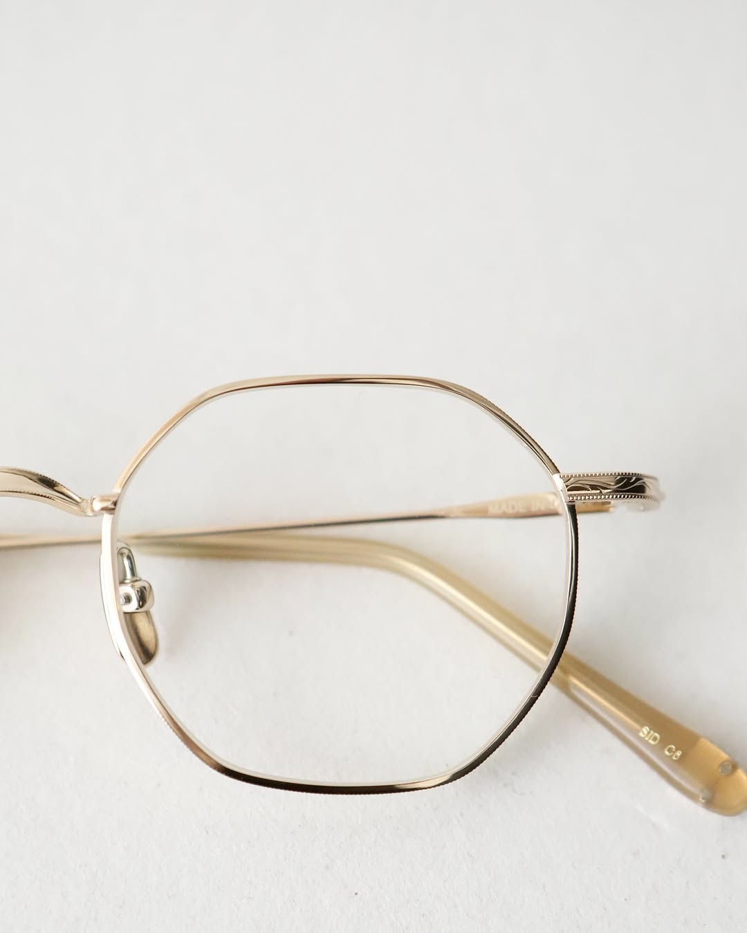 Yellows Plus hexagon-shaped metal frame SID. It has thick side rims and elaborate metal engravings on the sides for a luxurious finish. The material is titanium. which is lightweight and combines excellent durability with the elasticity of the material. making it a light and comfortable piece to wear.